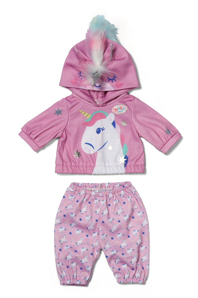 43cm nukelle sopiva kaksiosainen yksisarvisasu. Sisältää hupparin yksisarvissomisteilla ja housut.