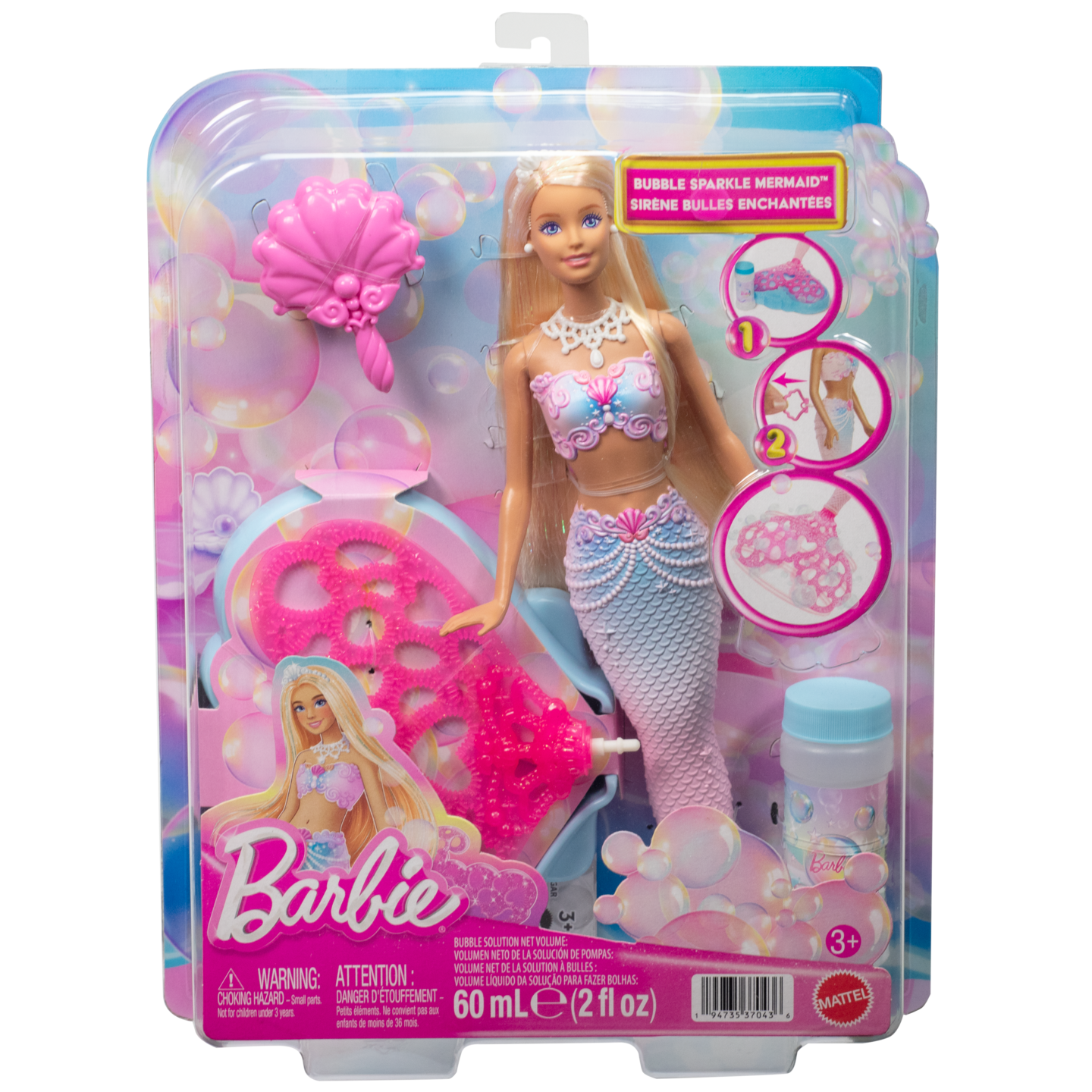 Lumoava merenneito-Barbie tekee kuplia! Kaada kuplaliuos tarjottimelle, kasta merenneidon pyrstö liuokseen ja vedä selässä olevasta narusta niin pyrstö pyörii ja luo kauniita kuplia. Merenneidolla on helmi- ja simpukkayksityiskohdilla koristeltu pyrstö ja siihen sopiva yläosa. Pitkissä hiuksissa on hohtavaa, sateenkaaren sävyistä kiiltoa, ja niitä voi kammata mukana tulevalla harjalla. Setti sisältää kuplatarjottimen, kuplaliuoksen, simpukka-aiheisen hiusharjan sekä merenneitonuken. 3+