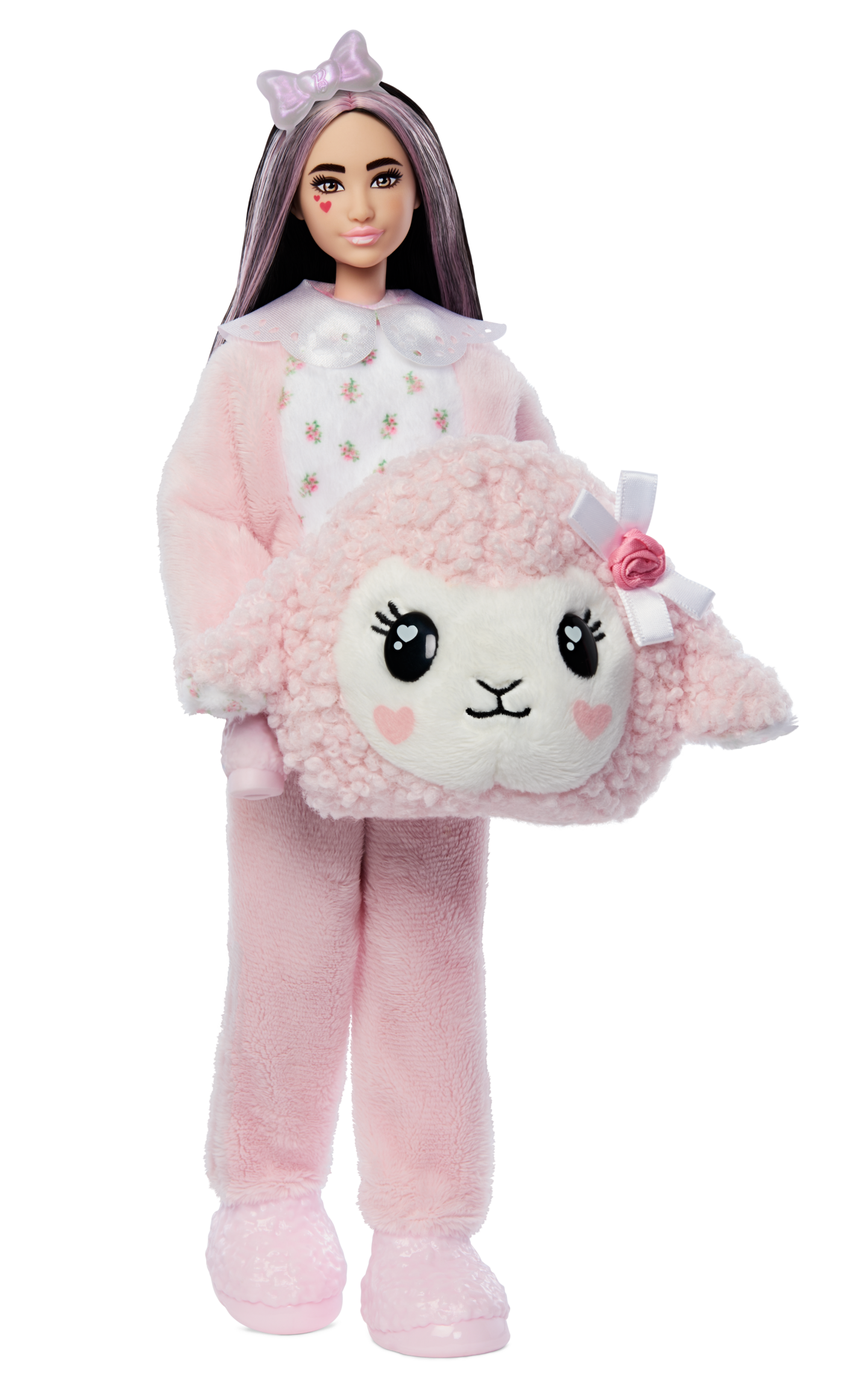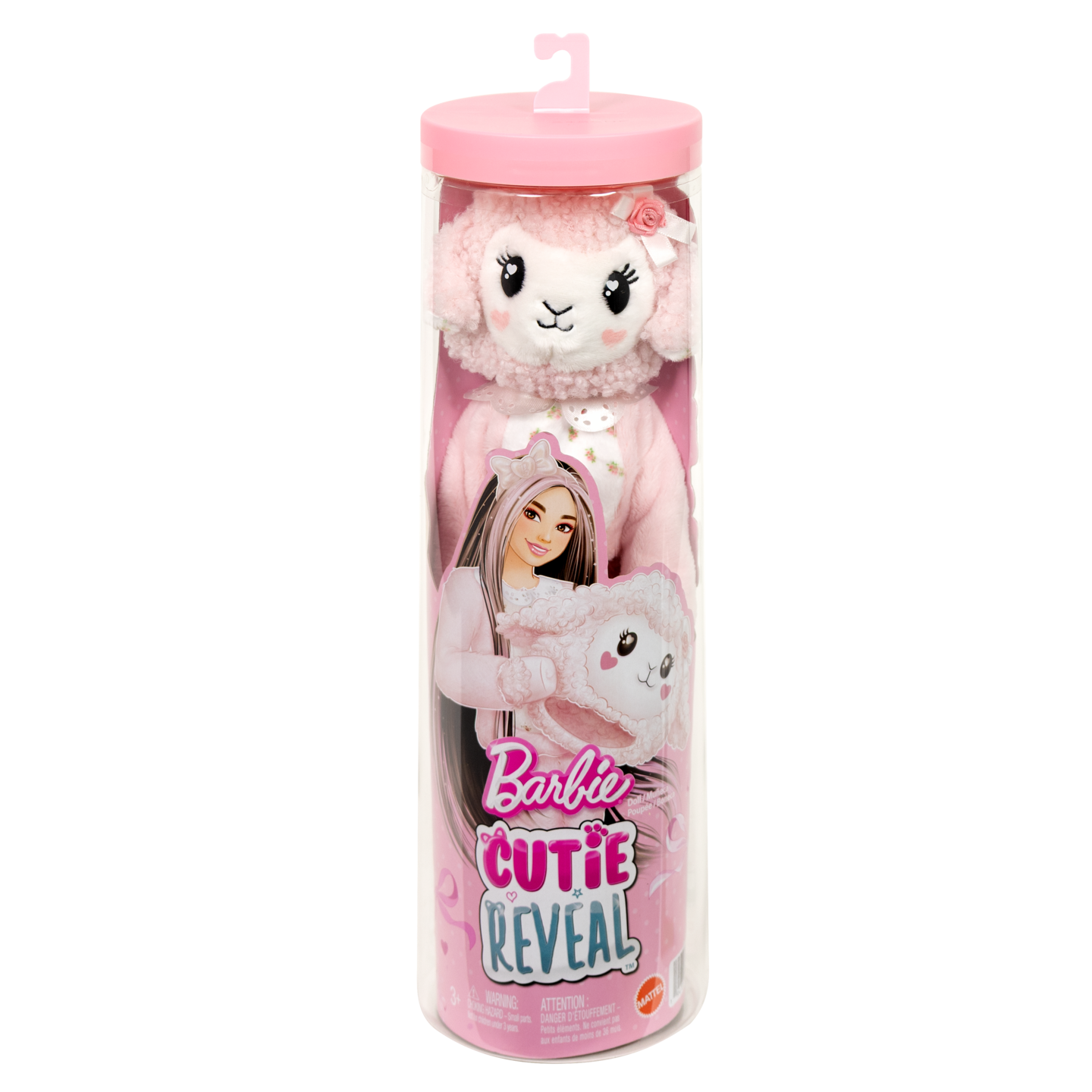 Barbie Cutie Reveal -nukke yhdistää pastellisävyt ja suloisen eläinteeman, täydellinen aurinkoisiin leikkeihin! Paljasta pehmeän lammasasun sisältä Barbie-nukke, jolla on pitkät, raidalliset hiukset ja suloiset kuviot poskissa. Mukana 10 yllätystä, kuten väriä vaihtava yksityiskohta ja kiiltävä rusettikampa. Käännettävä pehmotakki ja pehmeä kangashame ovat koristeltu pastellisilla kuvioilla. Mukana myös pieni lammas. 3+