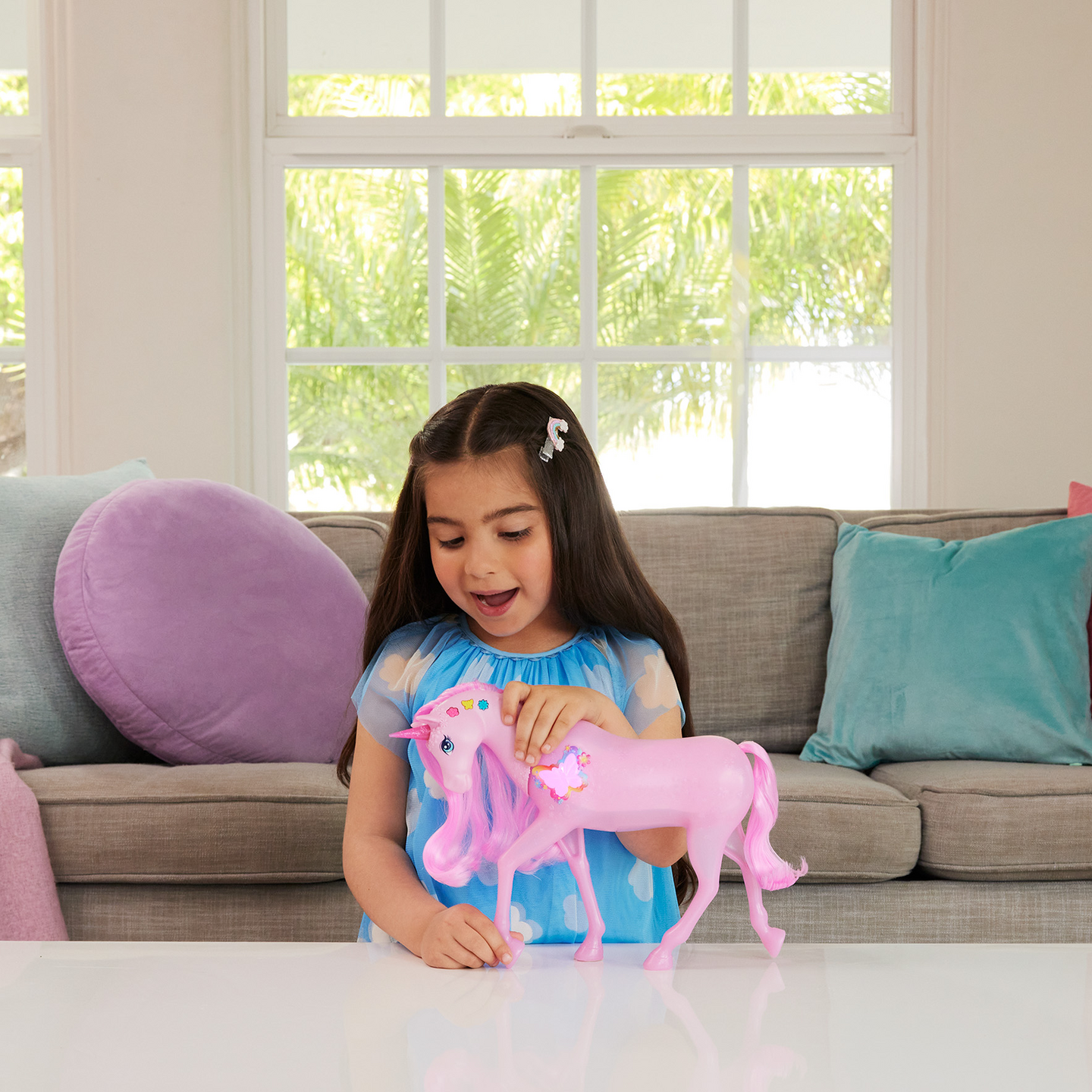 Upea Barbien yksisarvinen maagisin toiminnoin! Nappia painamalla saat yksisarviseen syttymään kauniit värivalot ja ihanat äänet. Valitse yksi väri tai muodosta upeita yhdistelmiä. Yht. 20 valo- ja äänitoimintoa. Korkeus 30 cm. Paristot 3xAAA sis. 3+