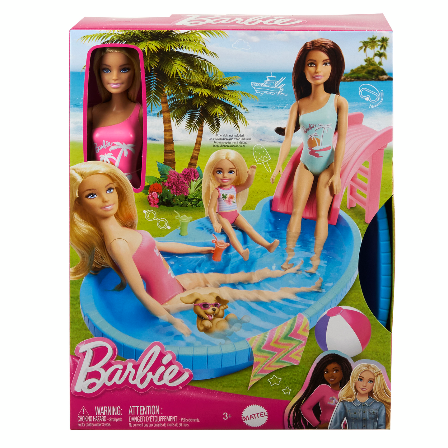 Barbie on valmiina kesään värikkäässä, kuvioidussa uima-asussaan. Barbien uima-altaassa on liukumäki ja pöytätaso juomia varten. Pakkaus sisältää nuken, uima-altaan, liukumäen, smoothiemukit kahdelle ja pyyheliinan. 3+