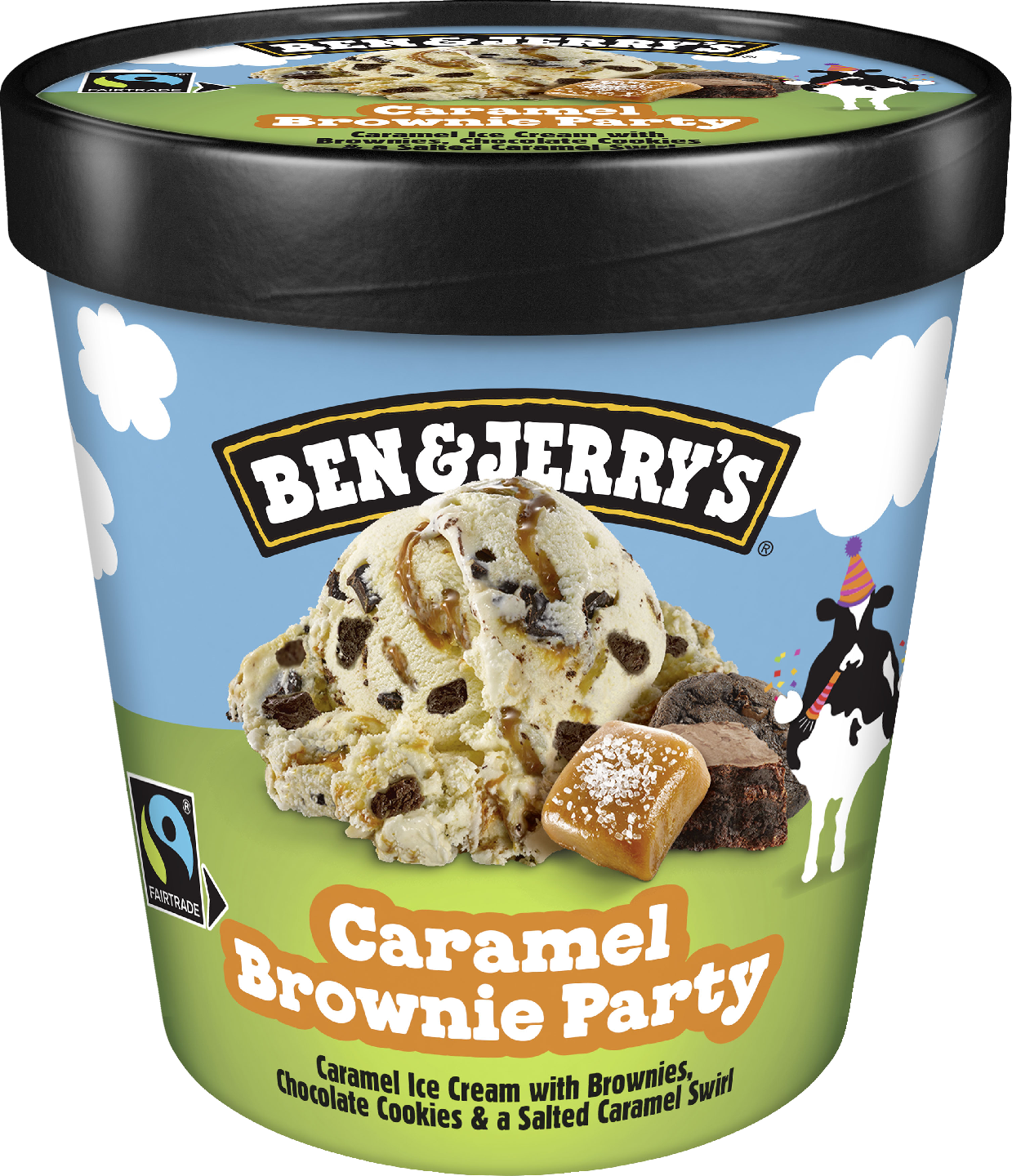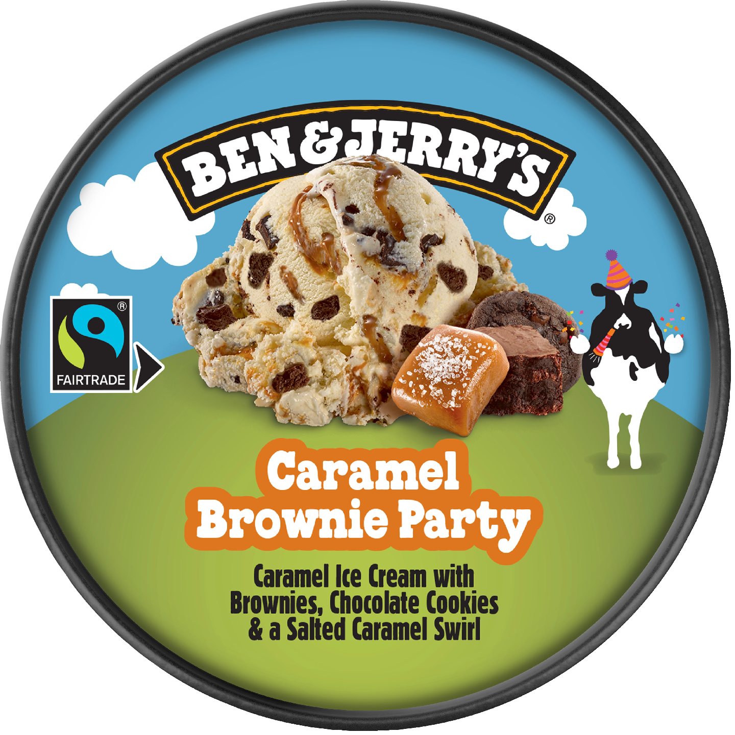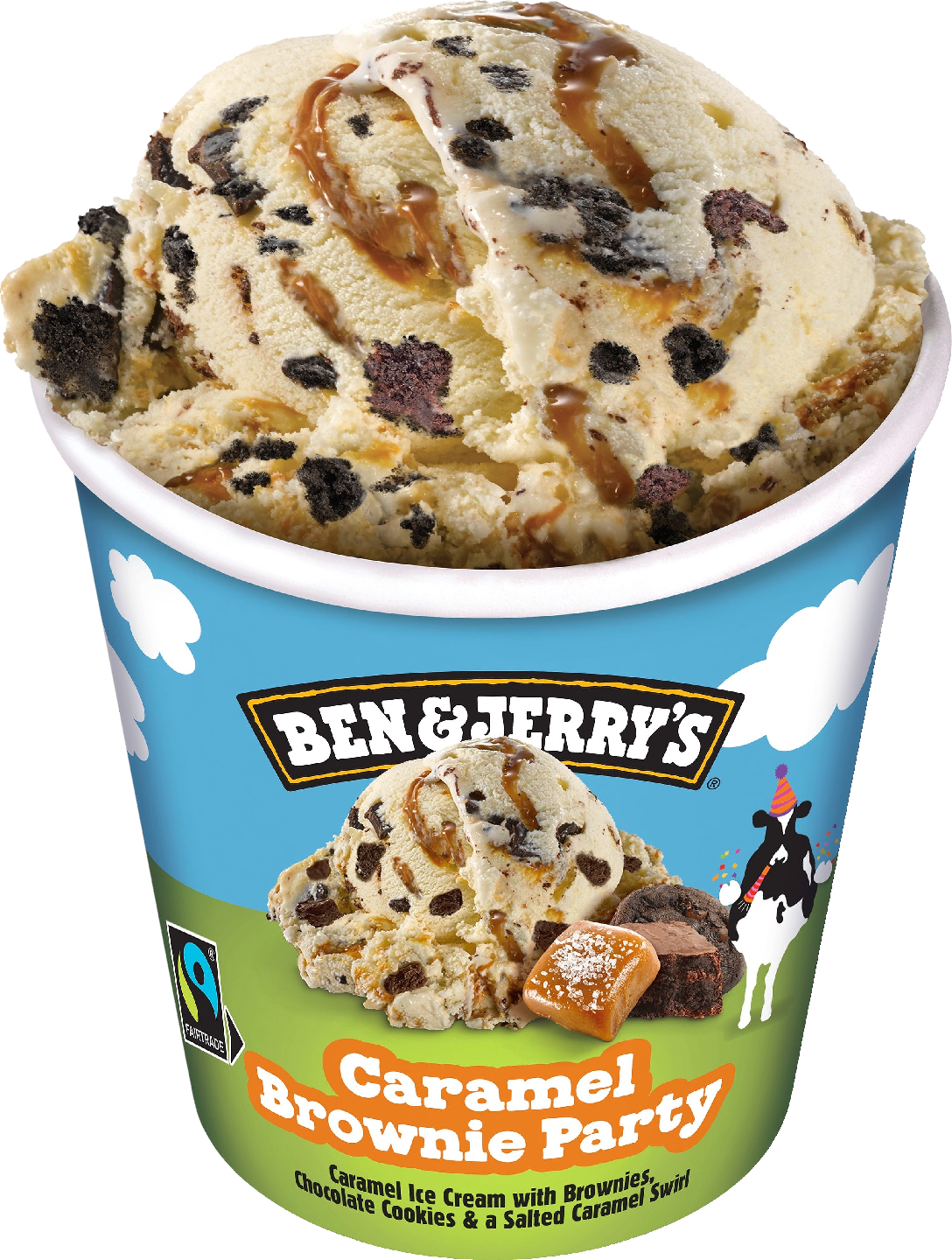 Karamellijäätelöä brownie- ja suklaakeksipaloilla, sekä suolaisella kinuskikastikepyörteellä