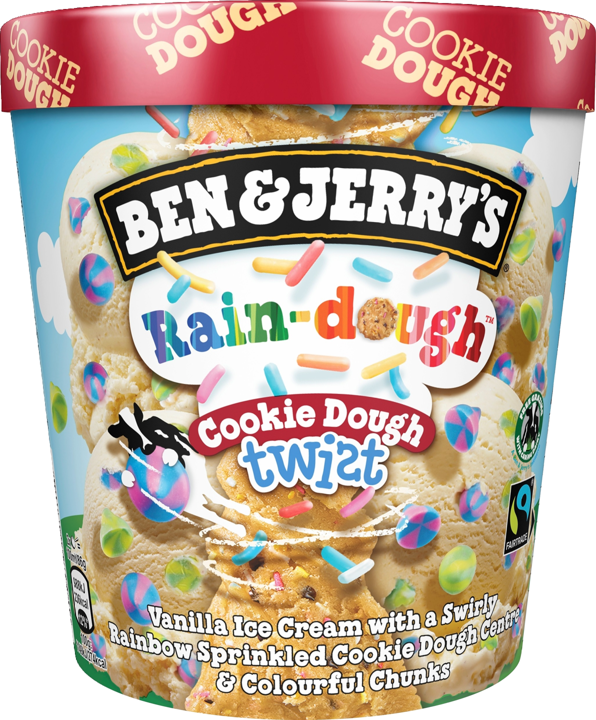 Vaniljajäätelöä, värikkäitä sattumia ja keskellä sateenkaaren värein koristeltua keksitaikinaa. Valmistaudu euforiaan sateenkaaren tuolla puolen! Ben & Jerry'sin keksitaikinan ja jäätelön yhdistävä Rain-dough Cookie Dough Twist tarjoaa makunystyröillesi huumaavia makuelämyksiä, jotka saavat sinut suorastaan repimään purkin kannen auki.[CRLF][CRLF]Sateenkaarissa on jotain erityistä, eikö olekin? Ne ovat harvinaisia, kauniita ja heijastavat taianomaisesti eri värejä. Sateenkaaria ei voi kuin ihastella joka kerta, kun ne ilmestyvät taivaalle. Sateenkaaret ovat kuin taivaan yksisarvisia. Ne muistuttavat meitä siitä, että ympärillämme on taikaa. Ben & Jerry'sin Rain-Dough Cookie Dough Twist on jäätelöaltaan sateenkaari. Se on värikäs, taianomainen ja täynnä makeita yllätyksiä, jotka ihmetyttävät sinua vielä pitkään sen jälkeen, kun olet nauttinut viimeisen jäätelölusikallisen. Värikäs keksitaikinaydin on kuin kulta-aarre sateenkaaren päässä (tai parempi, koska siinä on nonparelleja). Ja vaniljajäätelömme on kaikkea muuta kuin pelkkää vaniljaa.[CRLF][CRLF]Ben & Jerry'sin Rain-dough Cookie Dough Twist on valmistettu Reilun kaupan sokerista, kaakaosta ja vaniljasta. Lisäksi se on pakattu vastuullisesti tuotettuihin pakkauksiin, minkä ansiosta jokainen lusikallinen maistuu erityisen hyvältä!