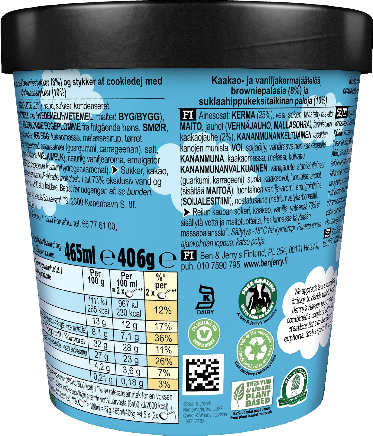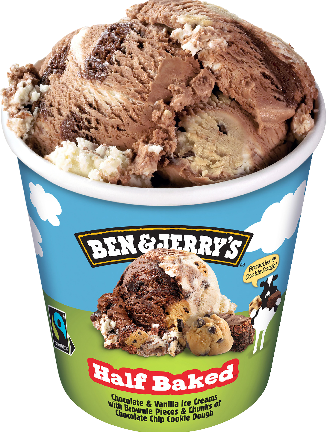 Tässä jäätelössä on tupla-annos makujen euforiaa: herkullinen Cookie Dough on sekoitettu ihanaan Chocolate Fudge Brownieen. Nappaa lusikka käteesi ja nauti! Vanilja-suklaajäätelö keksitaikinan paloilla ja browniesilla on täysin lyömätön yhdistelmä! Ben & Jerry's Half Baked on saanut nimensä, koska itse brownie on paistettu, mutta kakkutaikina ei. Maku on ollut bestseller vuodesta 2000, jolloin päätimme yhdistää klassiset jäätelöluomuksemme – Cookie Dough ja Chocolate Fudge Brownie. Edellinen, Cookie Dough, jossa on suuria keksitaikinan paloja vaniljajäätelön ympäröimänä, syntyi vuonna 1986 fanin anonyyminä makuehdotuksena. Lanseeraus tapahtui viisi vuotta myöhemmin ja on edelleen sensaatiomaisen suosittu makuelämys. Chocolate Fudge Brownie on suosittu jäätelömaku jossa on ihanaa suklaajäätelöä ja superhyvää Greyston Bakeryn valmistamaa brownieta. Se on tyydyttänyt suklaan ystävien jäätelön nälkää jo vuodesta 1991. Joskus on vaikea valita näiden kahden legendaarisen maun välillä. Half Bakedin kanssa sinun ei tarvitse. Saat molempien maailmojen parhaat puolet samassa –Vanilja-suklaajäätelö keksitaikinan paloilla ja browniesilla on lyömätön yhdistelmä!Kaikki alkoi siitä, kun kaksi kaveria alkoi myydä Vermontin Burlingtonissa sijaitsevasta kunnostetusta huoltoasemasta jäätelöä vuonna 1978. Heidän perustamastaan jäätelöyrityksestä tuli yhtä legendaarinen kuin jäätelöstä itsestään. Se oli seikkailun alku, joka on yhtä myyttinen kuin jäätelömme on hyvää. Jäätelömme tunnetaan nyt syrjäisilläkin seuduilla ja vaikeasti lausuttavilla nimillä ympäri maailmaa. Ben & Jerry's -jäätelön valmistukseen käytetään Reilun kaupan sertifioitua sokeria, kaakaota ja vaniljaa. Lisäksi jäätelö pakataan kestävään ja vastuullisesti tuotettuun pakkaukseen. Jäätelöpakkaus tulee säilyttää -18 °C:ssa tai kylmemmässä.