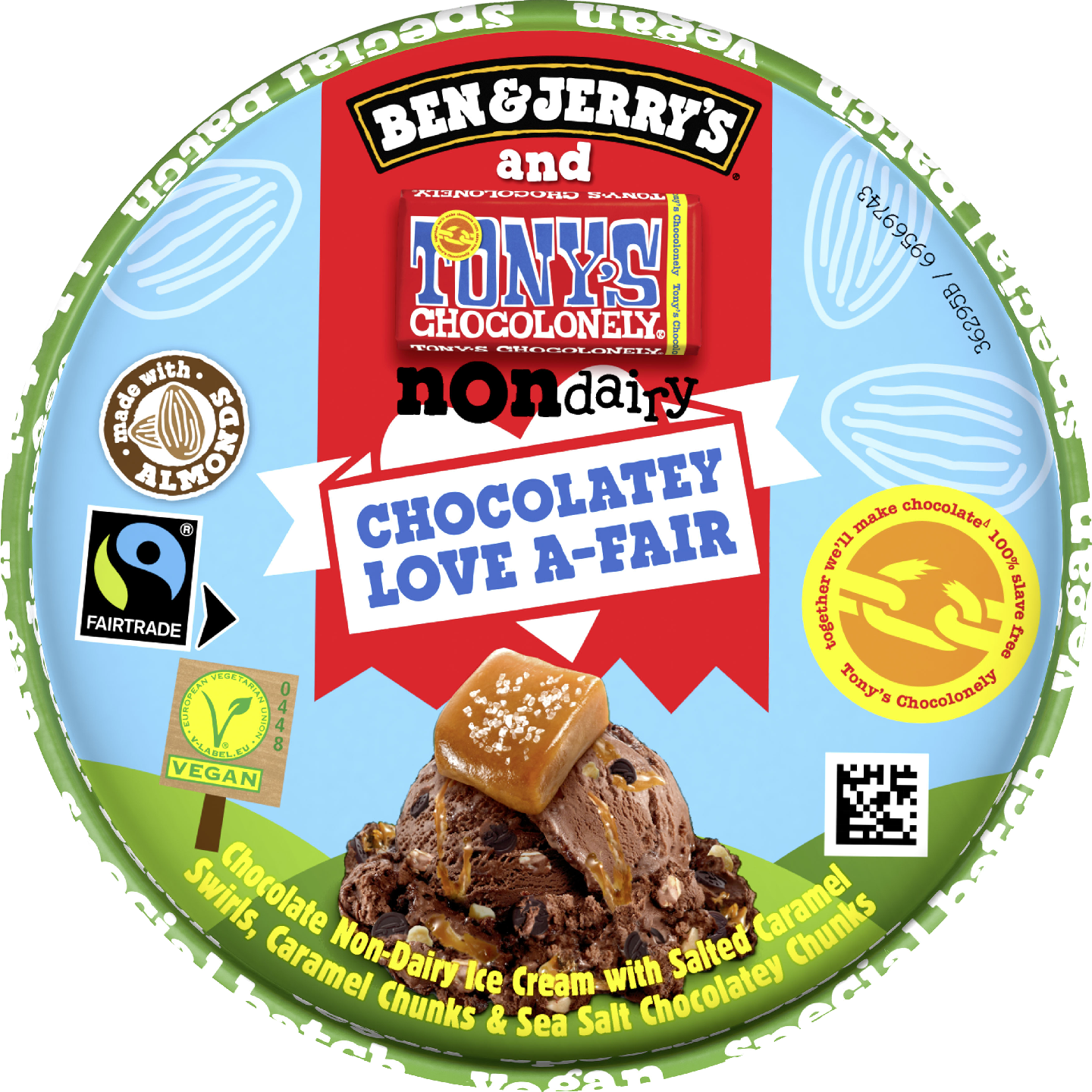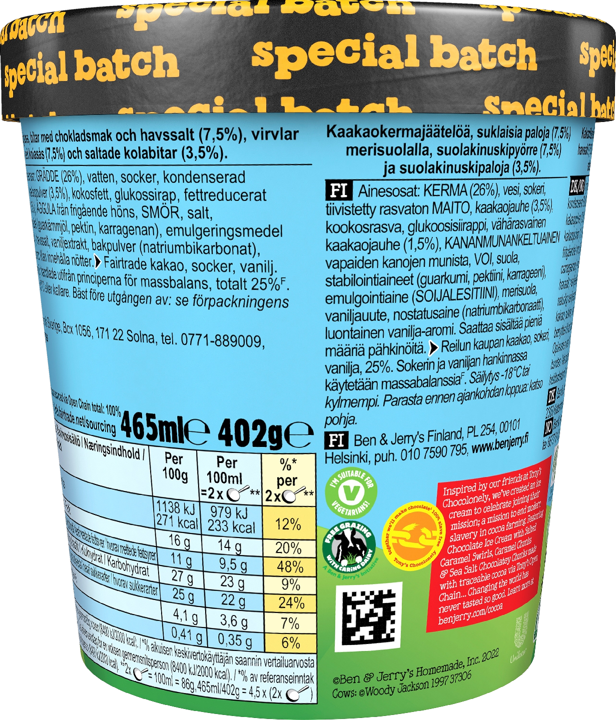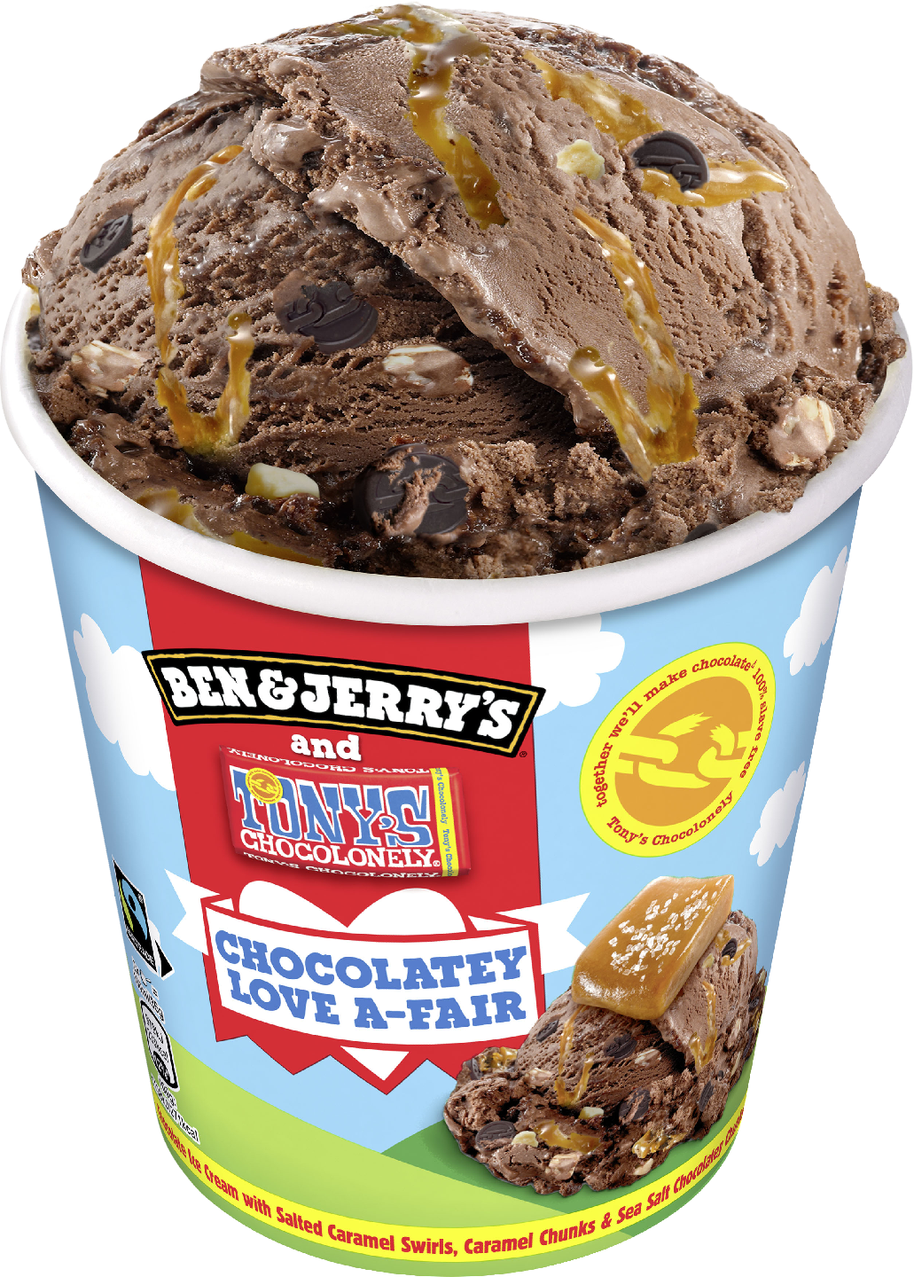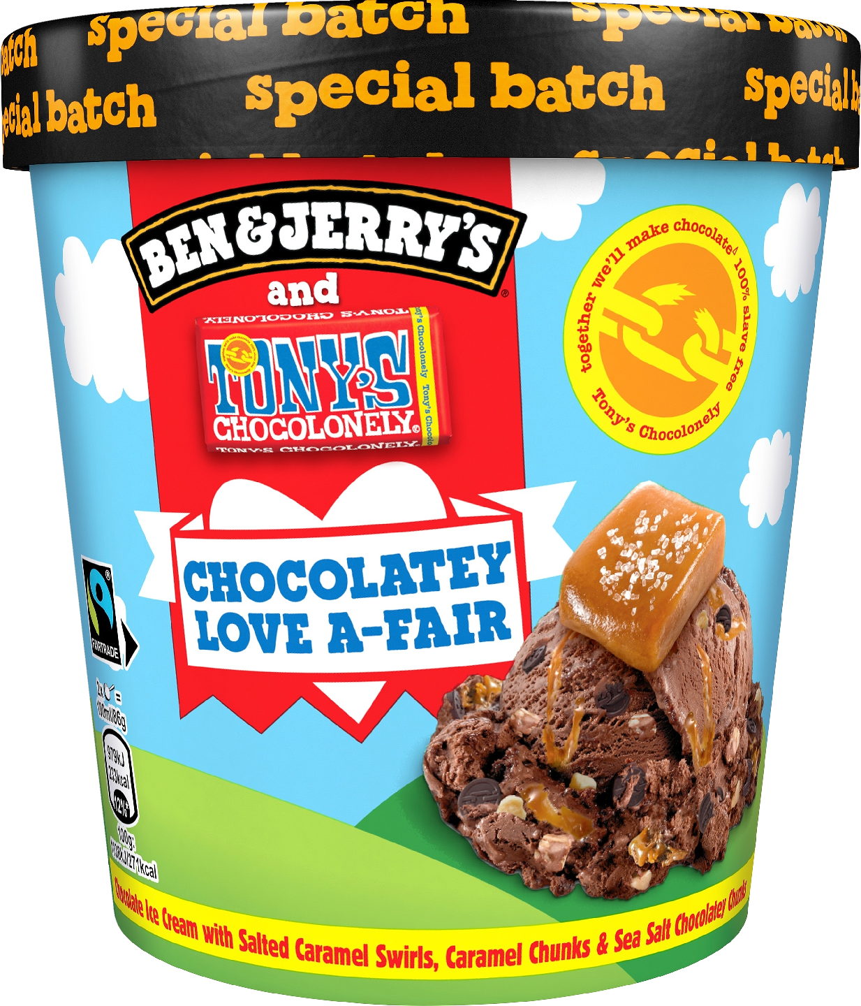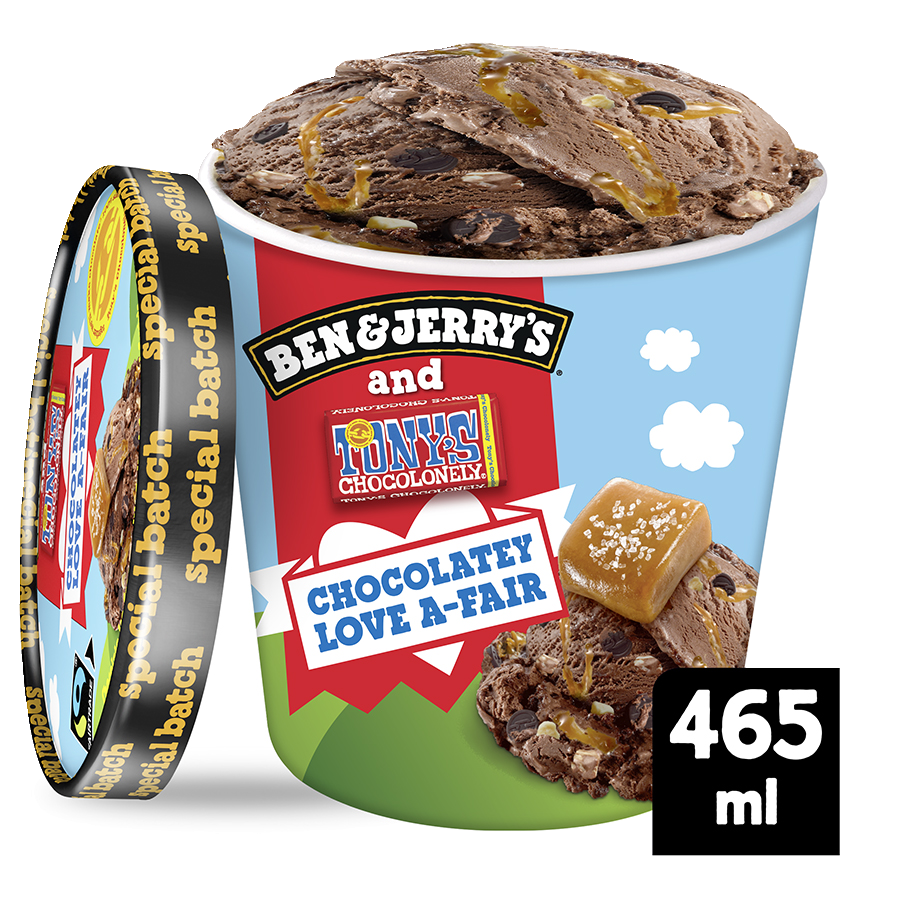 Ben & Jerry's Chocolatey Love A-Fair -jäätelö sisältää suklaajäätelöä, joka on täynnä suolakinuskipyörteitä, kinuskipaloja sekä merisuolalla maustettuja suklaisia paloja. Tämä erikoiserä on valmistettu yhteistyössä Tony's Chocolonelyn kanssa, ja yhdessä pyrimme tekemään suklaateollisuudesta täysin orjatyöstä ja laittomasta lapsityövoiman käytöstä vapaata. Maailman muuttaminen ei ole koskaan maistunut näin hyvältä. Ben & Jerry's on sitoutunut tekemään parhaan mahdollisen jäätelön parhaalla mahdollisella tavalla. Siksi tämä pakkaus on täynnä herkullista suklaajäätelöä, suussa sulavia pyörteitä, paljon suklaan ja rapean kinuskin palasia – ja siksi lähdimme Tony's Chocolonelyn mukaan tekemään suklaasta täysin orjatyöstä vapaata. Olemme sitoutuneet siirtymään Tony's Open Chain -aloitteeseen, joka on jäljitettävissä oleva ja eettinen lähestymistapa kaakaon hankintaan. Tavoitteenamme on lopettaa moderni orjuus ja lapsityövoiman käyttö suklaateollisuudessa. Kaikkien herkullisten jäätelöidemme tavoin Chocolatey Love A-Fair -jäätelö on Reilun kaupan sertifioitua, mikä tarkoittaa, että viljelijät saavat jo nyt lisämaksua kaakaon markkinahinnasta. Suhtaudumme suklaaseen vakavasti. Odotamme innolla matkaamme Tony's Chocolonelyn kanssa kohti entistä eettisempää kaakaontuotannon tulevaisuutta! Kaikki alkoi siitä, kun kaksi kaveria alkoi myydä Vermontin Burlingtonissa sijaitsevasta kunnostetusta huoltoasemasta jäätelöä vuonna 1978. Heidän perustamastaan jäätelöyrityksestä tuli yhtä legendaarinen kuin jäätelöstä itsestään. Se oli seikkailun alku, joka on yhtä myyttinen kuin jäätelömme on hyvää. Jäätelömme tunnetaan nyt syrjäisilläkin seuduilla ja vaikeasti lausuttavilla nimillä ympäri maailmaa. Ben & Jerry's -jäätelön valmistukseen käytetään Reilun kaupan sertifioitua sokeria, kaakaota ja vaniljaa. Lisäksi jäätelö pakataan kestävään ja vastuullisesti tuotettuun pakkaukseen. Jäätelöpakkaus tulee säilyttää -18 °C:ssa tai kylmemmässä. Ei liene mitään niin ikonista jäätelöpurkkia kuin Ben & Jerry's -jäätelöllä. Asia ei kuitenkaan aina ole ollut niin! Varhaisina vuosina Ben ja Jerry eivät – usko tai älä – myyneet jäätelöä purkeissa, vaan irtopalloina Burlingtonissa, Vermontissa. Oli alun perin Benin idea kokeilla pakata herkullista jäätelöä purkkeihin kotiinvietäväksi. Loppu, kuten tapaamme sanoa, on jäätelöhistoriaa. Mutta nyt riittää puheet. Nautitaan jäätelöstä. Tutustu laajaan valikoimaamme osoitteessa benjerry.fi