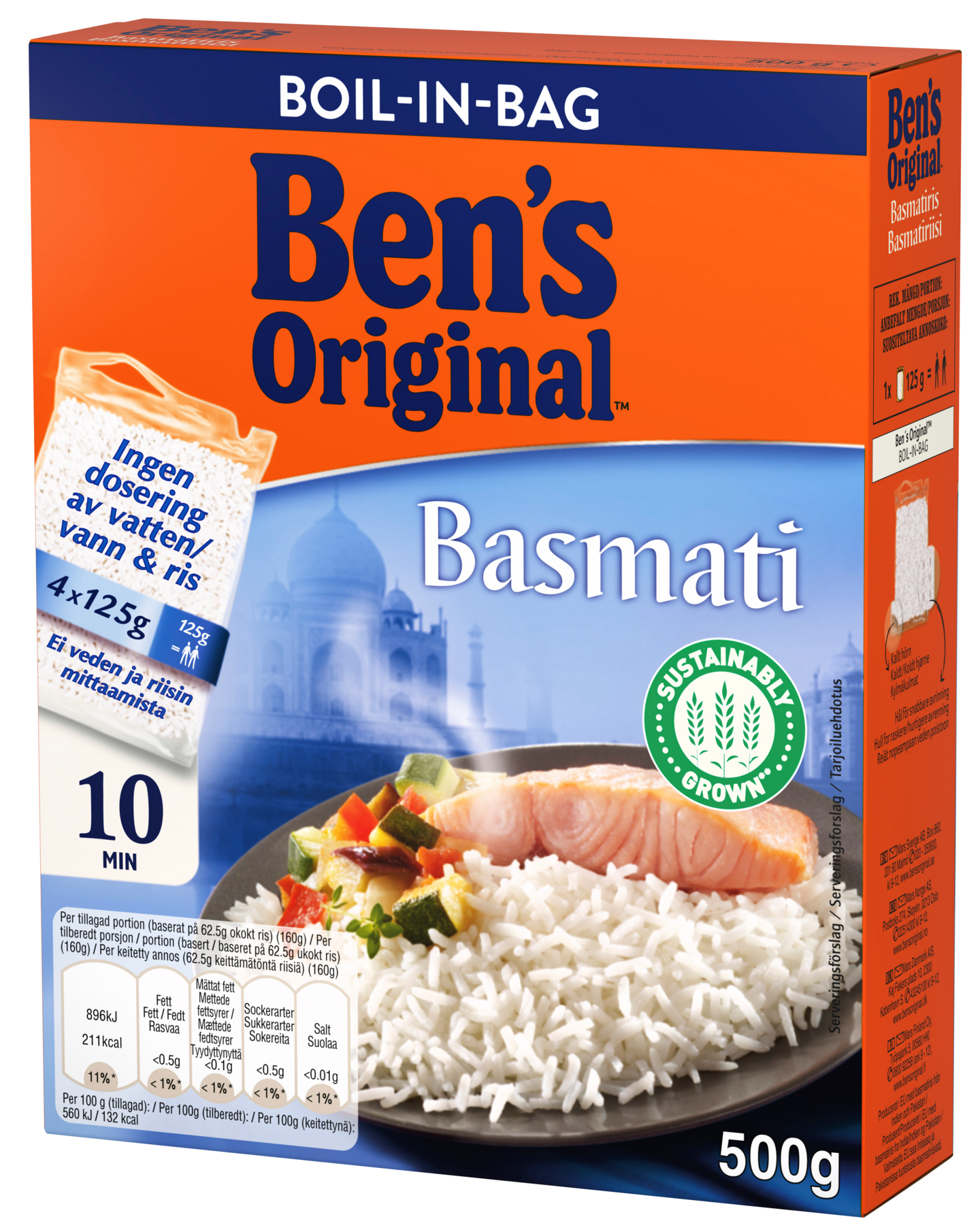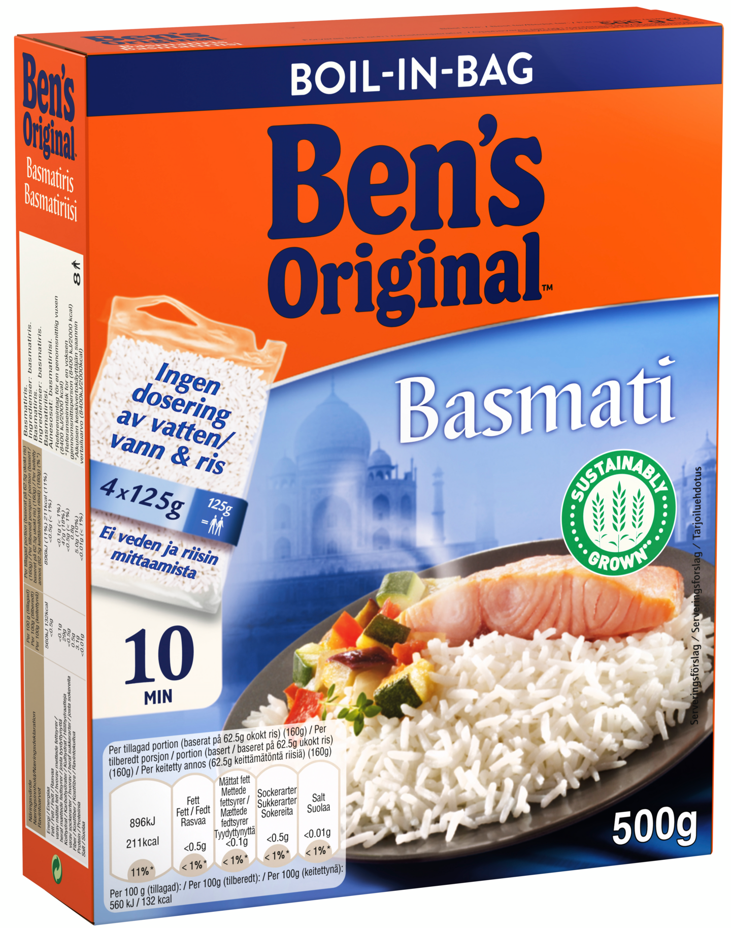 Ben's Original™ Basmatiriisi täyttää kestävän kehityksen vaatimukset. Sitä viljellään Intiassa Himalajan vuoriston juurella ja varastoidaan puoli vuotta, jotta sen luonnollinen aromikas tuoksu ja maku vahvistuvat. Sille tyypillinen pähkinäinen aromi tulee esille keitettäessä. Herkullinen riisi kypsyy vain 10 minuutissa. Keittopussi säästää veden mittaamisen vaivan ja poistaa riisin pohjaan palamisen vaaran.