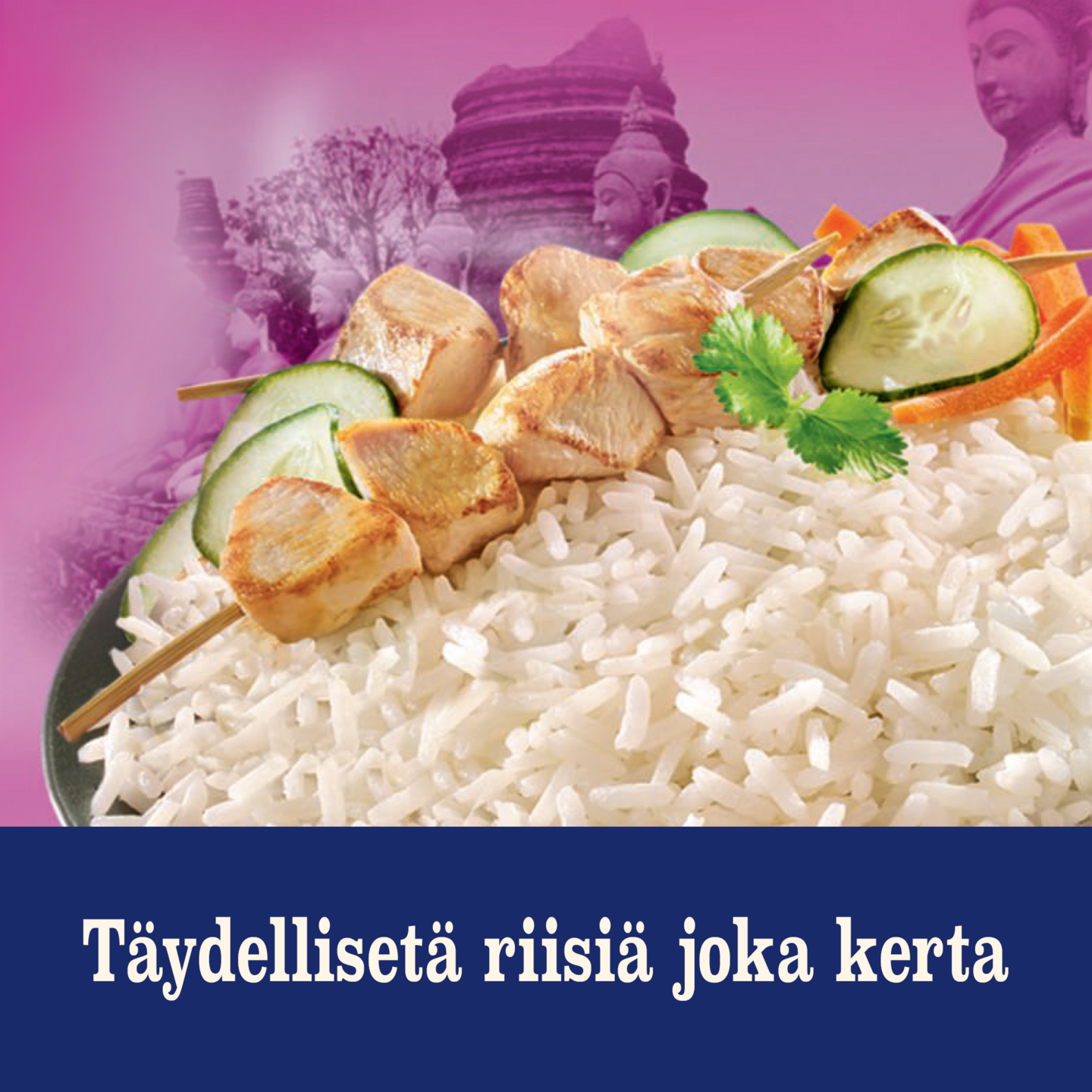 Pitkäjyväinen Ben's Original™ Jasmiinriisi on kaakkoisaasialainen erikoisuus. Sen luonnollinen aromikas tuoksu ja väri sekä kiiltävänvalkoinen hehku tuovat mieleen jasmiininkukat. Kun riisi keitetään, sen hedelmäinen, hieman makea aromi vapautuu. Tämä kevyesti tahmea riisi on oikea valinta kaikkiin eksoottisiin ruokalajeihin. Herkullinen riisi kypsyy vain 10 minuutissa. Keittopussi säästää veden mittaamisen vaivan ja poistaa riisin pohjaan palamisen vaaran.