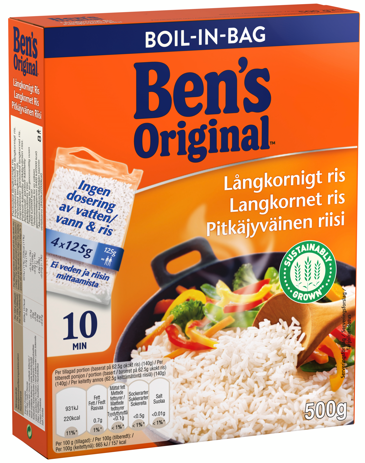 Pitkäjyväinen Ben's Original™ -riisi onnistuu aina täydellisesti. Ja aikaa kuluu vain 10 minuuttia! Keittopussi säästää veden mittaamisen vaivan ja poistaa riisin pohjaan palamisen vaaran.