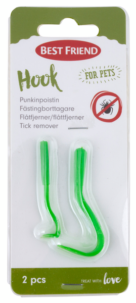 Best Friend Hook punkinpoistin on todella helppokäyttöinen: koukku liu'utetaan ihoon kiinnittyneen punkin alle, pyöräytetään hieman ja irrotetaan punkki kokonaisena. Iho puhdistetaan poiston jälkeen huolellisesti. Pakkauksessa on kaksi koukkua (4,5 ja 5,5 cm) erikokoisille punkeille. Tuote soveltuu punkkien poistoon niin lemmikeiltä kuin ihmisiltä. Korkealaatuisilla ja turvallisilla Best Friend välineillä ja tuotteilla lemmikin turkin ja ihon hoitaminen on helppoa ja samalla ylläpitää lemmikin terveyttä ja hyvinvointia.