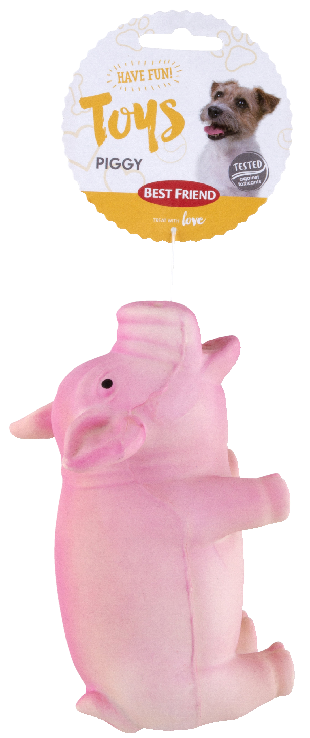 Best Friend Piggy lateksipossu on koirien suosikki! Lelu on täytetty pulleaksi vanulla ja se röhkii kuin aito possu! Lelu on valmistettu kestävästä ja taipuisasta lateksimateriaalista, joten se kestää leikkimistä. Lelun koko on 16 cm. Yhdessä leikkimisen kautta koira oppii uusia asioita, harjoittaa motorisia taitojaan ja oppii jo pentuna hahmottamaan lauman käyttäytymistä ja arvojärjestystä. Sisäleikkiin soveltuvat, pehmeät ja vinkuvat lelut ovat myös mainioita saaliita useimpien koirien rakastamiin metsästysleikkeihin. Best Friend testaa lelujaan säännöllisesti haitallisten kemikaalien osalta. Lemmikkiä tulee valvoa leikkimisen aikana ja poistaa rikkoontunut lelu käytöstä.