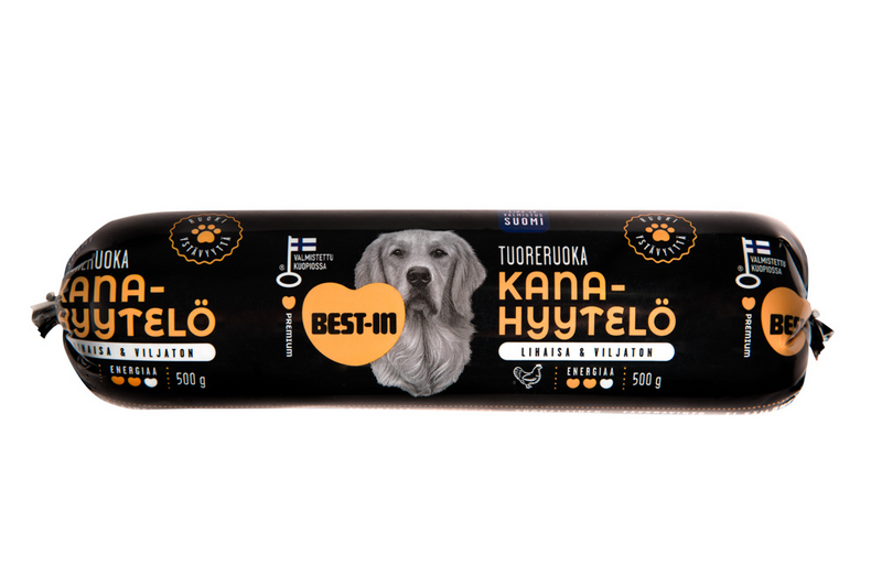 Kanasta valmistettu versio Best-In klassikkohyytelöiden joukossa! 100% suomalaista kanalihaa, eikä lainkaan viljaa. Proteiinipitoinen ja runsasenerginen Best-In Kanahyytelö soveltuu aikuisten koirien päivittäiseen ruokintaan. Hyvä valinta perusaktiivisille tai enemmän energiaa tarvitsevien koirien ravinnoksi. Best-In Kanahyytelö on suomalainen koiranruoka, jonka pääraaka-aineena on 100% suomalainen kananliha ja sisäelimet. Hyvän rasvahappokoostumuksen lisäksi koirasi saa kanasta laadukasta proteiinia, joka on erinomaisesti koiran ruoansulatuselimistön käytettävissä. Luontaisia vitamiineja täydentämään tuotteeseen on lisätty vitamiini- ja kivennäisaineet tasapainoittamaan ravintosisältöä. Tuoreruoka kypsennetään hellästi hauduttamalla – valmistusmenetelmä parantaa raaka-aineen hyödyntämistä koiran ruoansulatuselimistössä. Ravitsemuksellisesti laadukas tuoreruoka säilytetään jääkaapissa. Tämän vuoksi tuotteet ovat säilöntäaineettomia, eivätkä sisällä haitallisia lisäaineita. Käytämme ainoastaan puhtaita sekä turvallisia raaka-aineita ja toimimme Ruokaviraston valvonnan alla. Tuotteiden ja toiminnan laadun takeena meillä on laatu- ja ympäristösertifikaatit.