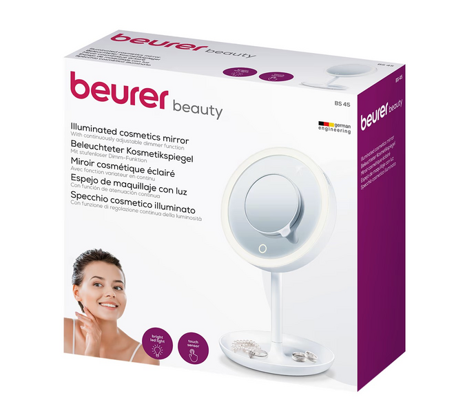 Beurer BS45 meikkipeilissä on mukana ylimääräinen irrotettava magneettinen peili, joka suurentaa viisin kertaisella suurennuksella. Ylimääräinen magneettinen peili kiinnittyy isomman peilin keskiosaan. Beurer BS45 meikkipeili on ihanteellinen meikkipöydällesi. Peilin jalustassa on kulhomainen osa, joka on ihanteellinen kosmetiikan tai korujen säilytykseen. Beurer BS45 meikkipeilissä on automaattinen sammutus 15 minuutin kuluttua paristojen säästämiseksi ja käyttöajan pidentämiseksi. Peili tarvitsee 3xAA paristot toimiakseen – paristot tulevat paketissa mukana.
