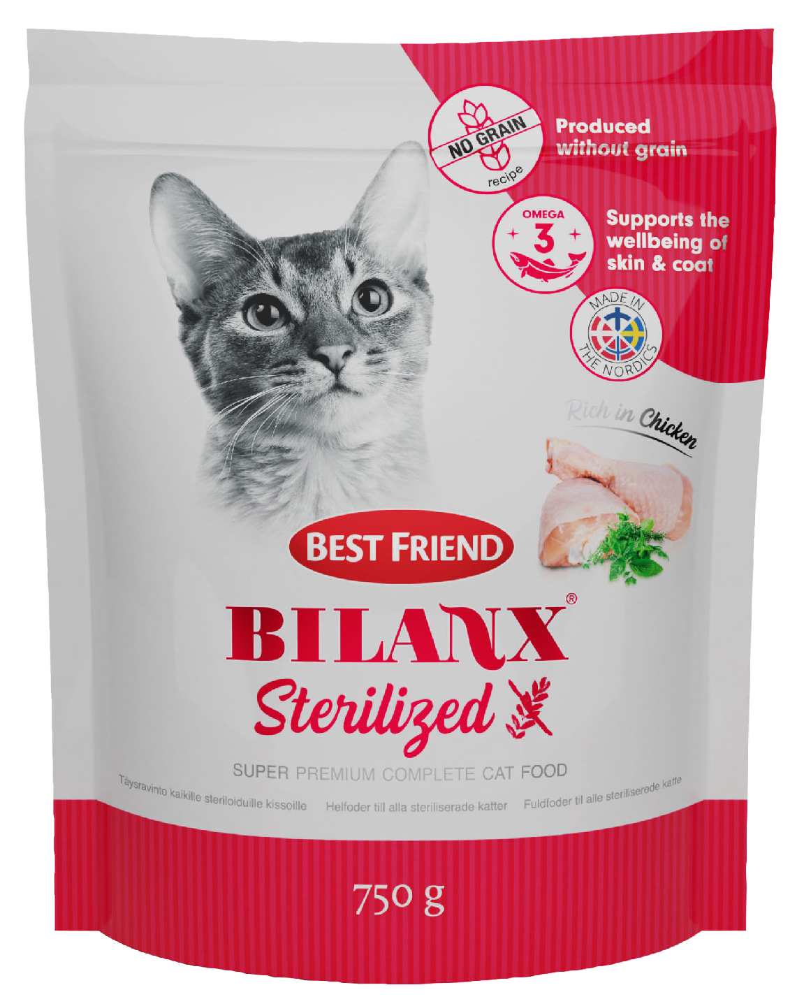 Bilanx Viljaton Steriloitu -korkealaatuinen, ravintorikas ruoka kissoille Mikset tarjoaisi vain parasta kissallesi? Maukas Bilanx Viljaton Steriloitu super premium ruoka sopii steriloiduille ja kastroiduille kissoille. Koska kissat ovat lihansyöjiä, on tärkeää, että ruoka on tasapainoista ja täyttää kissan kaikki vaadittavat ravinnontarpeet. Korkea ravinnon lihapitoisuus on kissoille luontaista, siksi Bilanx Viljaton Steriloitu sisältää runsaasti korkealaatuista eläinperäistä proteiinia. Maistuvuus on kaikki kaikessa! Matalampi energiapitoisuus auttaa painonhallinnassa. Kylmäpuristetun lohiöljyn Omega-3 rasvahapot tukevat kissan turkin ja ihon hyvinvointia. Frukto-oligosakkaridit ja mojaven jukkapalmu tukevat ruoansulatusta, sekä auttavat vähentämään hajuhaittoja kissanhiekkalaatikolla. Ei lisättyä gluteenia tai sokeria. Bilanxin maukkaat kuivaruoat pitävät huolta kissasi hyvinvoinnista koko sen eliniän ajan. Eläinlääkäreiden suunnittelemien tuotteiden laatua tarkkaillaan, testataan ja kehitetään jatkuvasti. Saatavana eri makuvaihtoehtoja. Bilanx – vain parasta kissallesi! fi