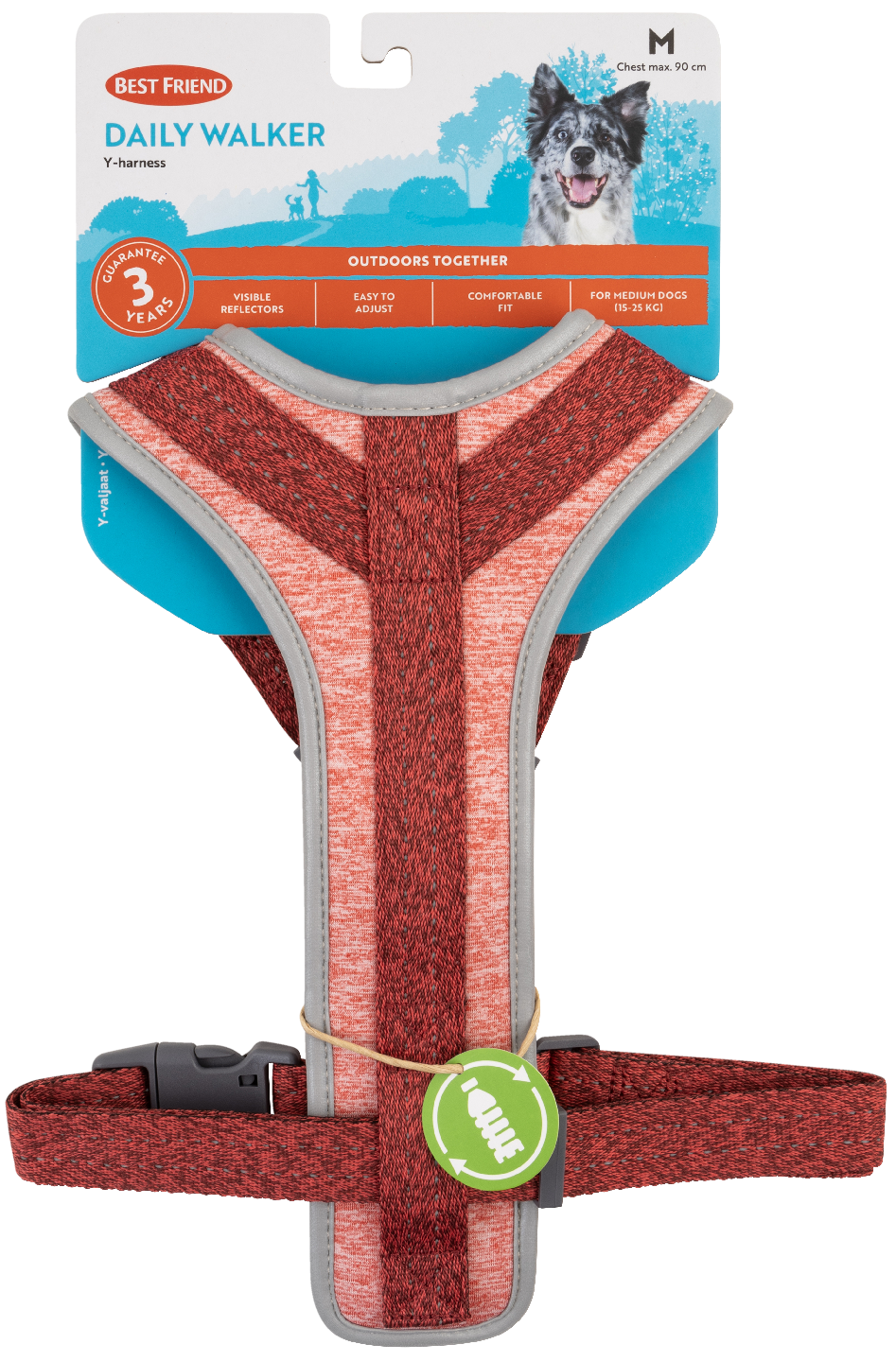 Best Friend Daily Walker koiran Y-valjaat M ovat ergonomiset, pehmustetut ja laadukkaat valjaat keskikokoisille koirille. Valjaat sopivat erittäin hyvin päivittäiseen lenkkeilyyn ja harrastuksiin, sillä ne ovat tukevat ja miellyttävät koiralle käytössä. Valjaiden erinomainen säädettävyys, sekä pääntiellä että rinnanaympäryksessä, takaavat hyvän istuvuuden. Valjaan tehokkaat heijastimet nauhoissa sekä etukappaleen heijastinkantti lisäävät näkyvyyttä ja turvallisuutta pimeällä. Valjaiden nauhat ovat GRS-sertifioitua, kierrätettyä 100% PET -materiaalia ja rintakappale sekä pehmuste ovat pehmeää neopreeniä. Kaikki Daily Walker koiran valjaat ovat vetolujuustestattua laatua. Parhaan kaverin mukana kaikissa seikkailuissa! Värilajitelma. Treat with love.