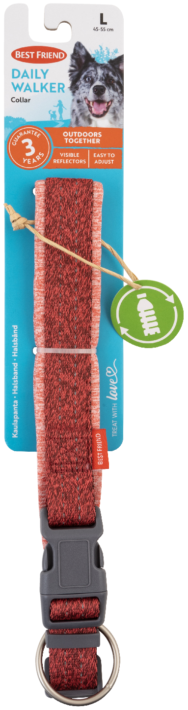 Best Friend Daily Walker koiranpanta L on pehmustettu ja laadukas panta isoille koirille. Panta sopii erittäin hyvin päivittäiseen lenkkeilyyn ja harrastuksiin, sen ergonomisen muotoilun ja kevyen neopreenipehmusteen ansiosta. Panta on miellyttävä koiralle käytössä ja pistolukollisen pannan turvalukitusmekanismi ohjaa vedon aiheuttaman rasituksen pois soljesta tehden pannasta turvallisemman ulkoilutustilanteissa. Nauhoissa olevat tehokkaat heijastimet lisäävät näkyvyyttä ja turvallisuutta pimeällä. Pannan nauhat ovat GRS-sertifioitua, kierrätettyä 100 % PET -materiaalia ja pehmuste on pehmeää neopreeniä. Kaikki Daily Walker koiran pannat ovat vetolujuustestattua laatua. Parhaan kaverin mukana kaikissa seikkailuissa! Treat with love. Värilajitelma.