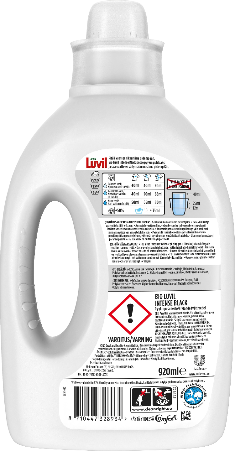 Bio Luvilin sisältämä Fabric Care Tech -teknologia auttaa pitämään huolta väreistä ja kankaista, jotta sinä voit nauttia kauniista vaatteista pitkään. Bio Luvil Black -pyykinpesuneste on kehitetty erityisesti tummille vaatteille. Se pesee mustat ja tummat vaatteet tehokkaasti puhtaaksi ja auttaa säilyttämään niiden värin – pitää mustan mustana. Pyykinpesuneste ei sisällä väriaineita, lisäksi se on tehokas myös matalissa lämpötiloissa.Bio Luvil tehoaa hyvin myös pinttyneeseen likaan. Sitkeät ja pinttyneet tahrat häviävät ja pyykkiisi jää ihanan puhdas tuoksu. Monipuolisesta Bio Luvil -pyykinpesutuotesarjasta löydät jokaiseen tarpeeseen ja kullekin tekstiilille sopivan pesuaineen villasta silkkiiin, kirjavasta tummaan ja sporttiseen.Jos ihosi on herkkä reagoimaan ja haluat suojata omaa ja perheenjäsentesi ihoa, suosittelemme Bio Luvil Sensitive Color -pyykinpesuaineita. Sensitive-pesuaineiden ainesosat ja niiden pitoisuudet eivät yleisesti ärsytä tai herkistä, siksi ne sopivat myös herkkäihoisille sekä pienten lasten vaatteiden pesuun.Bio Luvil on Suomen toiseksi suosituin pyykinpesuainemerkki ja pyykinhuollon asiantuntija, johon suomalaiset luottavat. Bio Luvil tuli markkinoille jo vuonna 1962 ja sitä valmistettiin alun perin paikallisesti. Suomalaiset yhdistävät edelleen Bio Luviliin perinteikkyyden, pitkän tradition ja korkean laadun. Historiallisesti Bio Luvil tunnetaan erityisesti tehokkuudestaan vaikeiden tahrojen poistajana. Pitkään Bio Luvil oli myös ainoa nestemäinen pyykinpesuaine, jonka koostumus myös hoiti vaatteita. Vuodesta 2021 alkaen Bio Luvilia on saanut myös helppokäyttöisinä pesukapseleina. Valmiiksi annostellun kapselin ansiosta säästyt pesuainemäärän mittailulta.