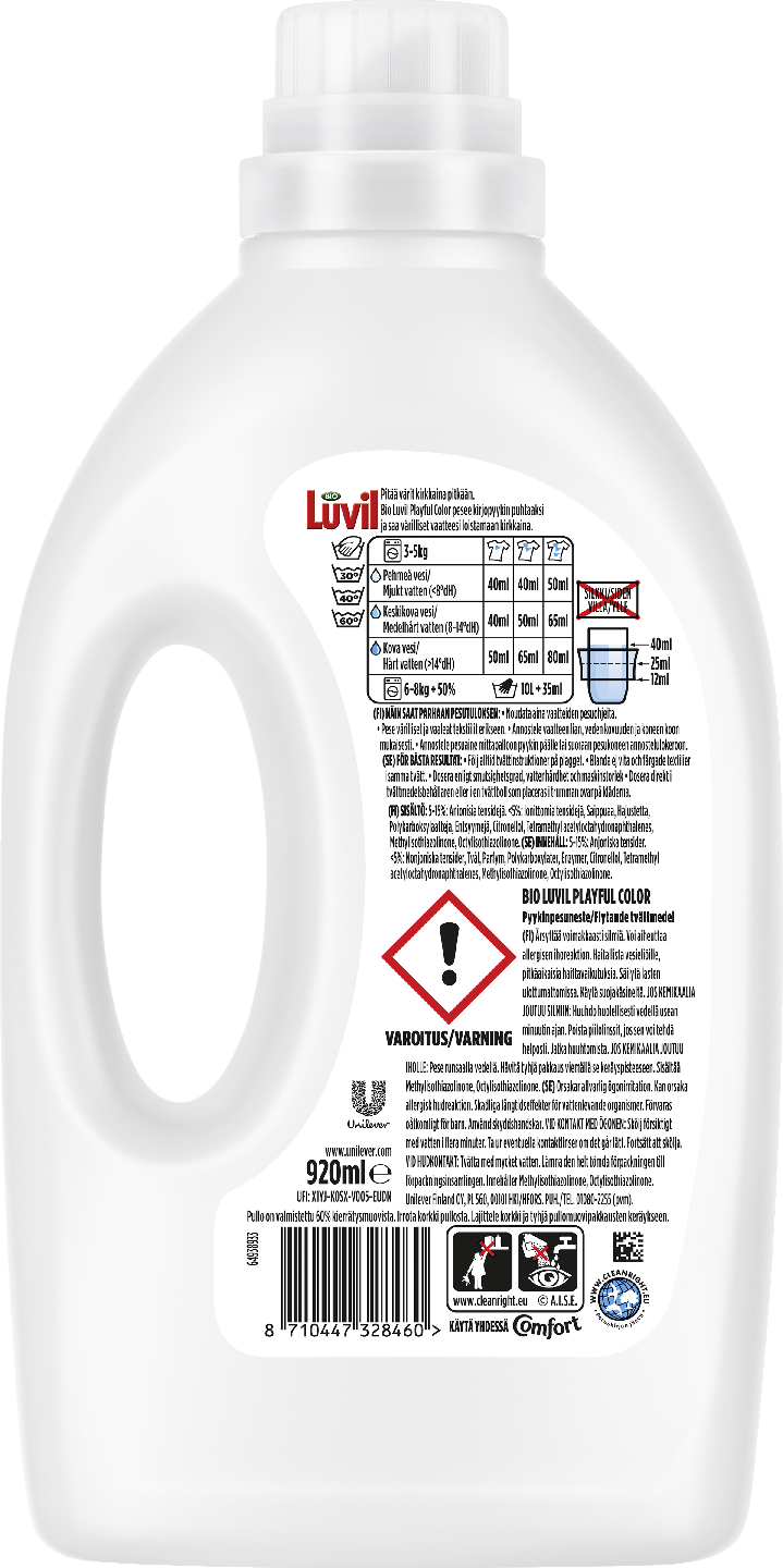 Bio Luvil Color nestemäinen pyykinpesuaine puhdistaa värilliset vaatteet tehokkaasti ja saa kirjopyykkisi värit loistamaan. Bio Luvil Color on erityisesti värillisille vaatteille suunniteltu pyykinpesuneste. Bio Luvil Color -pyykinpesunesteen sisältämä teknologia irrottaa nukkaa tekstiilien pinnasta ja kirkastaa värejä. Nestemäinen pyykinpesuaine pesee ja huuhtoutuu hyvin myös matalammissa pesulämpötiloissa, joten vaatteisiin ei jää pesuainejäämiä. Bio Luvil huolehtii vaatteistasi, jotta sinä voisit nauttia kauniista vaatteista pidempään! Sitkeätkin tahrat häviävät vaatteista ja niihin jää ihanan puhdas tuoksu. Monipuolisesta Bio Luvil -pyykinpesutuotesarjasta löydät jokaiseen tarpeeseen ja kullekin tekstiilille sopivan pesuaineen villasta silkkiiin, kirjavasta tummaan ja sporttiseen. Jos ihosi on herkkä reagoimaan ja haluat suojata omaa ja perheenjäsentesi ihoa, suosittelemme Bio Luvil Sensitive Color -pyykinpesuaineita. Ne eivät sisällä hajusteita eikä väriaineita. Pesuaineiden ainesosat ja niiden pitoisuudet eivät yleisesti ärsytä tai herkistä, siksi ne sopivat myös herkkäihoisille sekä pienten lasten vaatteiden pesuun. Bio Luvil on Suomen toiseksi suosituin pyykinpesuainemerkki ja pyykinhuollon asiantuntija. Bio Luvil tuli markkinoille jo vuonna 1962 ja sitä valmistettiin alun perin paikallisesti. Suomalaiset yhdistävät edelleen Bio Luviliin perinteikkyyden, pitkän tradition ja korkean laadun. Historiallisesti Bil Luvil tunnetaan erityisesti tehokkuudestaan vaikeiden tahrojen poistajana. Pitkään Bio Luvil oli myös ainoa nestemäinen pyykinpesuaine, jonka koostumus myös hoiti vaatteita. Vuodesta 2021 alkaen Bio Luvilia on saanut myös helppokäyttöisinä pesukapseleina. Valmiiksi annostellun kapselin ansiosta säästyt pesuainemäärän mittailulta. Bio Luvil nestemäinen -pyykinpesuaine – riittoisa pakkauskoko 920 ml.