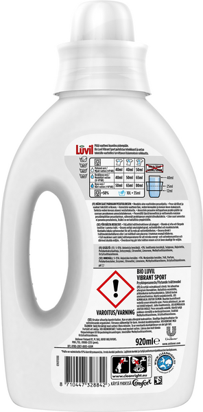 Bio Luvil Sport on suunniteltu erityisesti ulkoilu- ja urheiluvaatteille. Se on kehitetty erityisesti teknisille tekstiileille ja siinä on hajuja neutralisoiva koostumus. Bio Luvil Sport- pesuaine ei sisällä valkaisuainetta. Nestemäinen pyykinpesuaine pesee ja huuhtoutuu hyvin myös matalammissa pesulämpötiloissa.