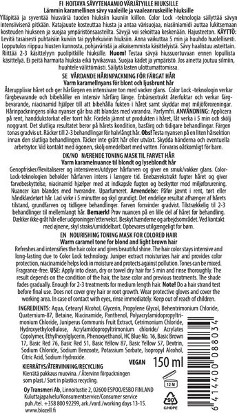 HOITAVA SÄVYTENAAMIO VÄRJÄTYILLE HIUKSILLE. Lämmin karamellinen sävy vaaleille ja vaaleanruskeille hiuksille. Ylläpitää ja syventää hiusväriä tuoden hiuksiin kauniin kiillon. Color Lock -teknologia säilyttää sävyn intensiivisenä pitkään. Katajauute kosteuttaa hiusta ja antaa värisuojaa, niasiiniamidi auttaa lukitsemaan kosteuden hiukseen ja suojaa ympäristönsaasteilta. Sävyjä voi sekoittaa keskenään. Hajusteeton.