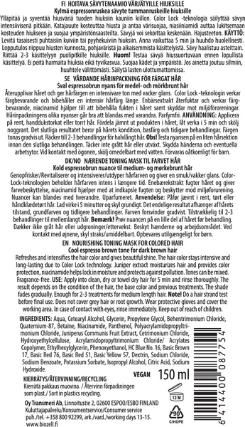 HOITAVA SÄVYTENAAMIO VÄRJÄTYILLE HIUKSILLE. Kylmä espressonruskea sävyte tummanruskeille hiuksille. Ylläpitää ja syventää hiusväriä tuoden hiuksiin kauniin kiillon. Color Lock -teknologia säilyttää sävyn intensiivisenä pitkään. Katajauute kosteuttaa hiusta ja antaa värisuojaa, niasiiniamidi auttaa lukitsemaan kosteuden hiukseen ja suojaa ympäristönsaasteilta. Sävyjä voi sekoittaa keskenään. Hajusteeton.