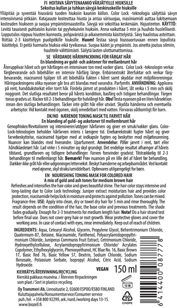 HOITAVA SÄVYTENAAMIO VÄRJÄTYILLE HIUKSILLE. Sekoitus kullan ja tuhkan sävyjä keskiruskeille hiuksille. Ylläpitää ja syventää hiusväriä tuoden hiuksiin kauniin kiillon. Color Lock -teknologia säilyttää sävyn intensiivisenä pitkään. Katajauute kosteuttaa hiusta ja antaa värisuojaa, niasiiniamidi auttaa lukitsemaan kosteuden hiukseen ja suojaa ympäristönsaasteilta. Sävyjä voi sekoittaa keskenään. Hajusteeton.