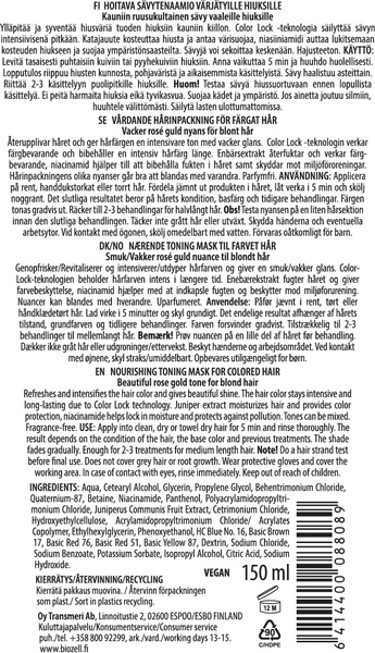 HOITAVA SÄVYTENAAMIO VÄRJÄTYILLE HIUKSILLE. Kauniin ruusukultainen sävy vaaleille hiuksille. Ylläpitää ja syventää hiusväriä tuoden hiuksiin kauniin kiillon. Color Lock -teknologia säilyttää sävyn intensiivisenä pitkään. Katajauute kosteuttaa hiusta ja antaa värisuojaa, niasiiniamidi auttaa lukitsemaan kosteuden hiukseen ja suojaa ympäristönsaasteilta. Sävyjä voi sekoittaa keskenään. Hajusteeton.