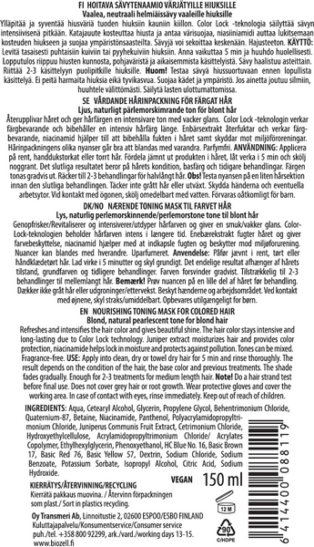 HOITAVA SÄVYTENAAMIO VÄRJÄTYILLE HIUKSILLE. Vaalea, neutraali helmiäissävy vaaleille hiuksille. Ylläpitää ja syventää hiusväriä tuoden hiuksiin kauniin kiillon. Color Lock -teknologia säilyttää sävyn intensiivisenä pitkään. Katajauute kosteuttaa hiusta ja antaa värisuojaa, niasiiniamidi auttaa lukitsemaan kosteuden hiukseen ja suojaa ympäristönsaasteilta. Sävyjä voi sekoittaa keskenään. Hajusteeton.