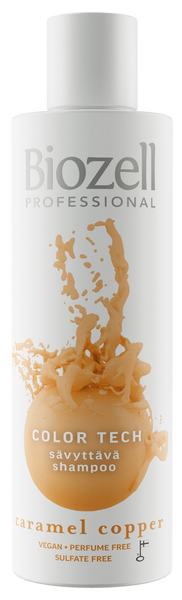Biozell Professional Color Tech sävyttävä shampoo Caramel Copper antaa kauniin toffee ja kuparin sävyn vaaleille ja ruskeille hiuksille. Shampoo puhdistaa hiukset hellävaraisesti. Helppo ja nopea käyttää, vaikutusaika vain 2-5 min. Sävy kestää hiuslaadusta riippuen 4-6 pesukertaa. Hoitaa ja kosteuttaa hiuksia. Poistaa sähköisyyttä ja antaa kiiltoa. Antioksidanttinen ja suojaa hiuksia UV-säteilyltä. Hajusteeton ja vegaaninen. Kehitetty ja valmistettu Suomessa.