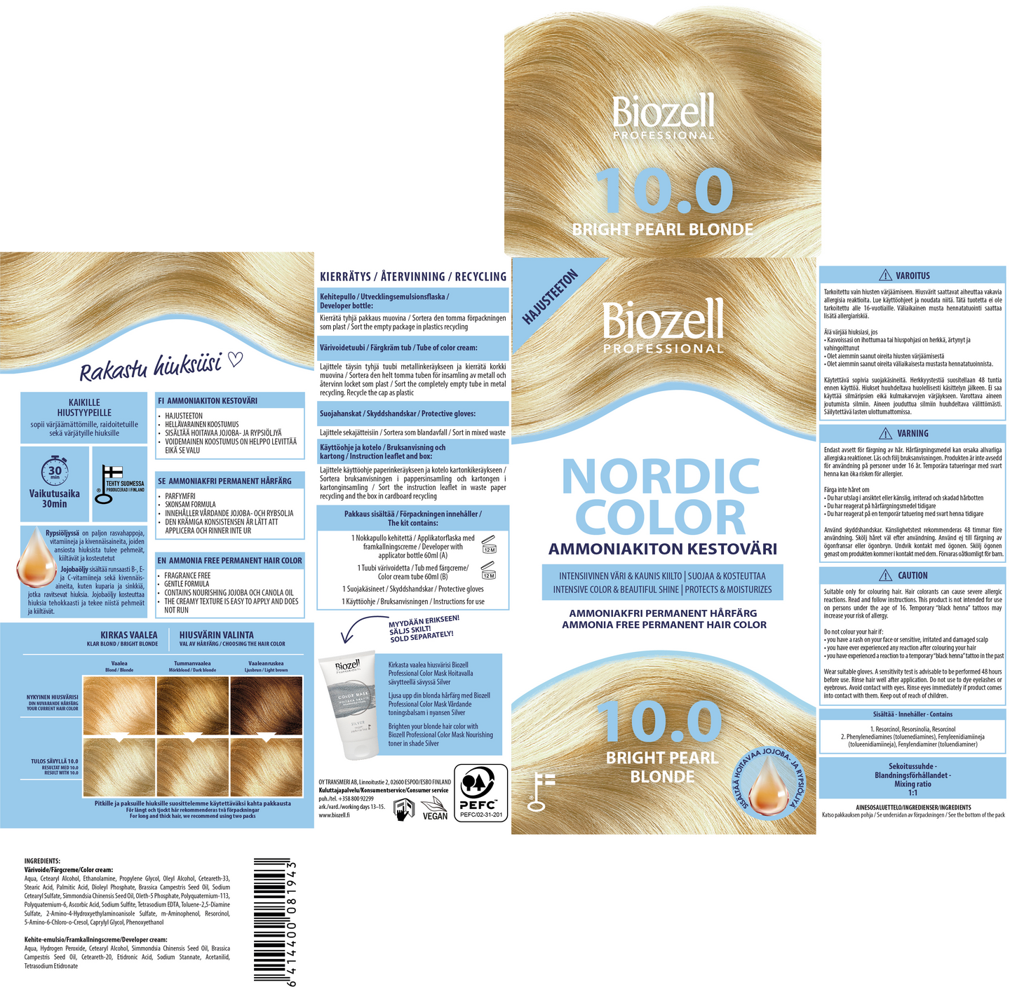 Ammoniakiton ja hajusteeton kestoväri, joka antaa intensiivisen, mutta luonnollisen lopputuloksen esimerkiksi tyvikasvun peittämiseen, oman luonnonvärin kirkastamiseen. Valmistettu Suomessa. Nordic Color -värit sisältävät rypsi- ja jojobaöljyjä, jotka kosteuttavat hiusta ja hiuspohjaa sekä auttavat hiusväriaineita tunkeutumaan syvemmälle hiuskuituun, jolloin värinkesto paranee. Vegaaninen. Kirkas vaalea.