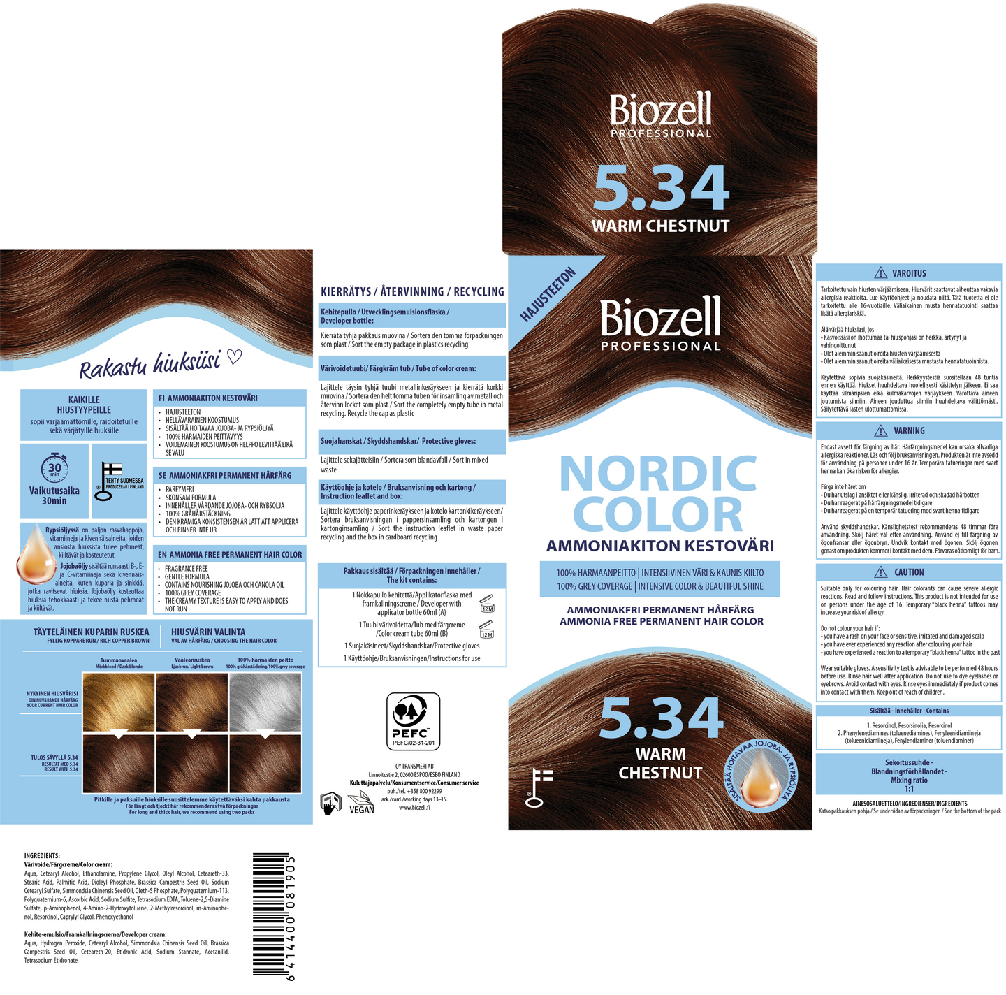 Ammoniakiton ja hajusteeton kestoväri, joka antaa intensiivisen, mutta luonnollisen lopputuloksen esimerkiksi tyvikasvun peittämiseen, harmaiden hiusten jopa 100 % peittoon tai oman luonnonvärin kirkastamiseen. Täyteläinen lämmin kuparinruskea. Valmistettu Suomessa. Nordic Color -värit sisältävät rypsi- ja jojobaöljyjä, jotka kosteuttavat hiusta ja hiuspohjaa sekä auttavat hiusväriaineita tunkeutumaan syvemmälle hiuskuituun, jolloin värinkesto paranee. Vegaaninen.
