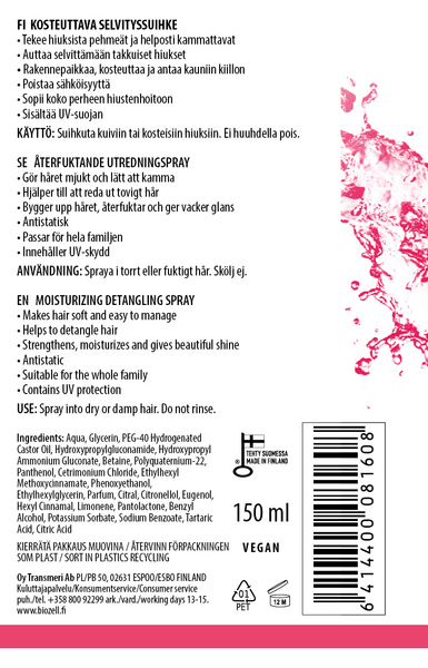 Tekee hiuksista pehmeät ja helposti kammattavat. Auttaa selvittämään takkuiset hiukset. Rakennepaikkaa, kosteuttaa ja antaa kauniin kiillon. Poistaa sähköisyyttä. Sopii koko perheen hiustenhoitoon. Sisältää UV-suojan. Vegaaninen. Valmistettu Suomessa.