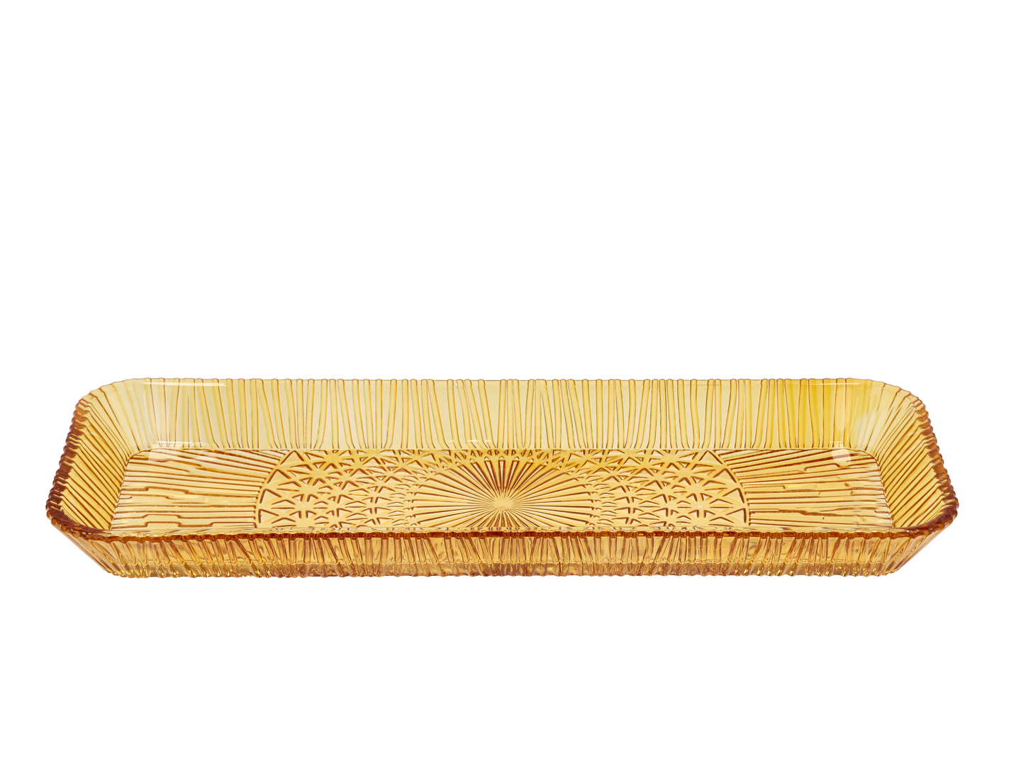 Kata ruokapöytä kauniilla, värillisestä lasista valmistetuilla lautasilla. On luontevaa yhdistää erilaisia materiaaleja kattauksessasi ja asettaa lasilautaset vastaavan väristen kivitavaroiden kanssa. Kaunis tarjoiluastia/lautanen antaa sinulle mahdollisuuden esitellä kulinaarisia luomuksiasi. Tarjoa herkullinen salaatti suorakaiteen muotoisella värillisestä lasista valmistetulla tarjoiluastialla, tai käytä sitä suolaisten liharuokien, viipaloitujen hedelmien tai pienten jälkiruokien esillepanoon. Kestää konepesun. Koko 38 x 14 cm.