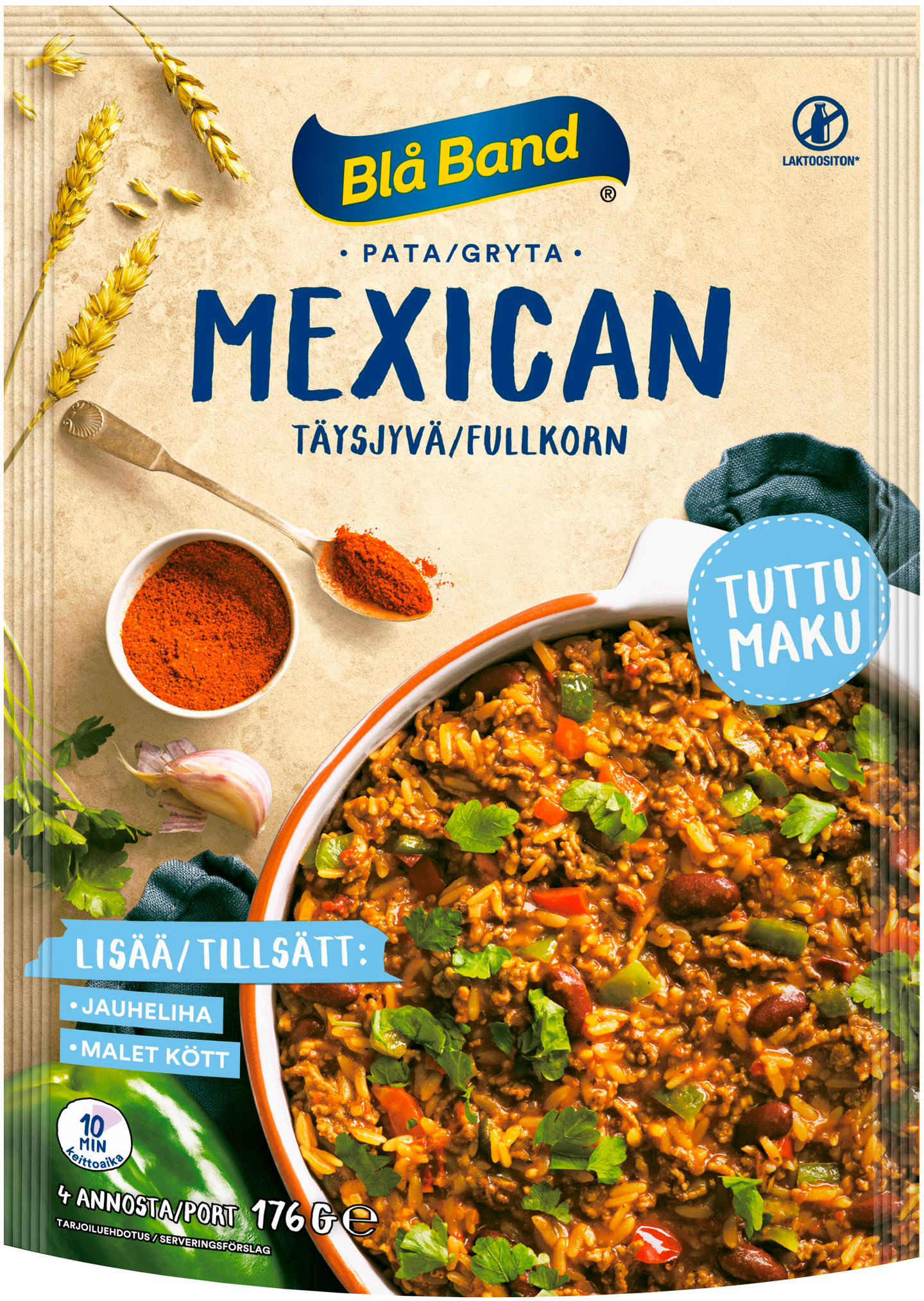 Täysjyvä Mexican pata on mausteinen täysjyväriisiä ja runsaasti kasviksia sisältävä pata, jonka tomaattista makua täydentävät valkosipuli, chili ja persilja. Kokeile jauhelihan sijaan kikherneitä. Vinkki! Valmista tortillat patatäytteellä. Tarjoa lisäksi tuoretta salaattia, vihanneksia, tomaattisalsaa, guacamolea ja crème fraîchea.
