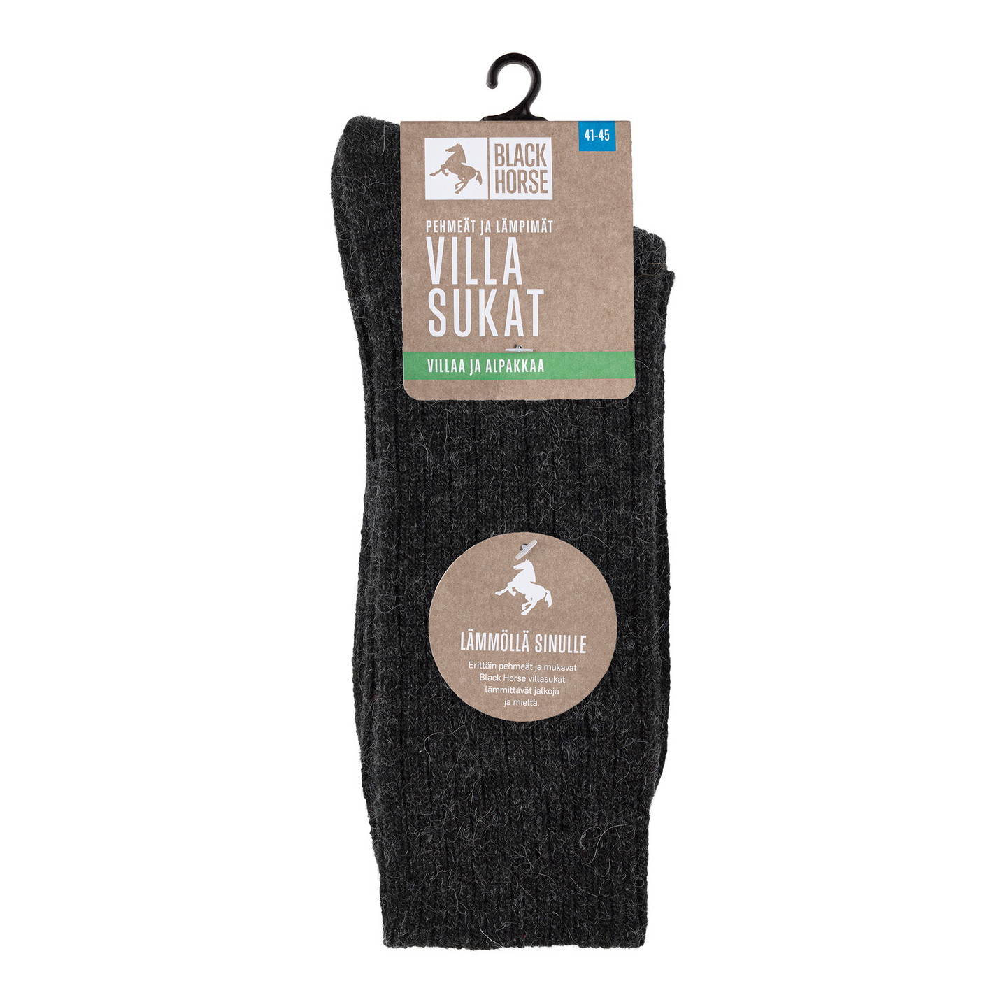 Ylellisen pehmeät Black Horse villasukat. Laadukkaat ja lämpimät villasukat pitävät jalat lämpimänä. Materiaali on joustavaa ja hengittävää villasekoitetta.