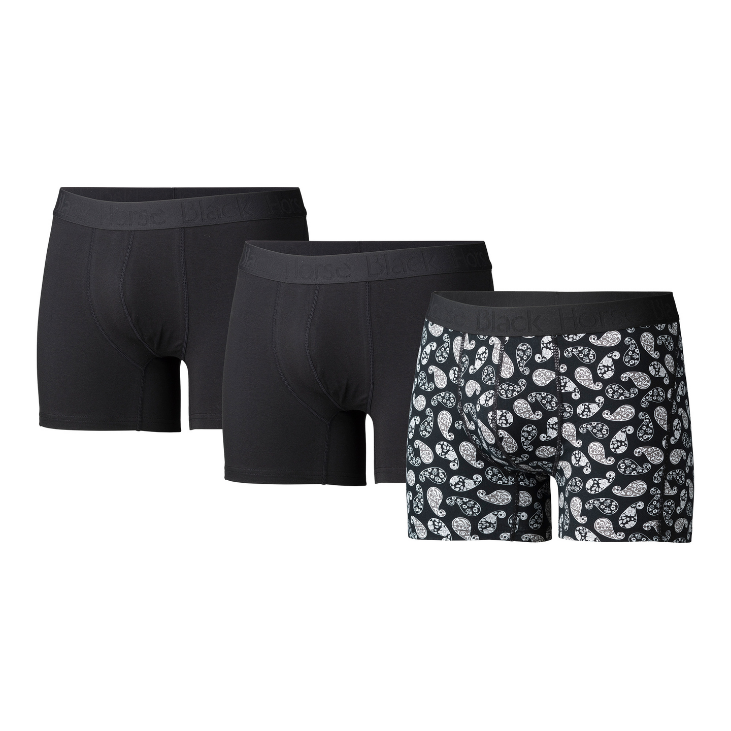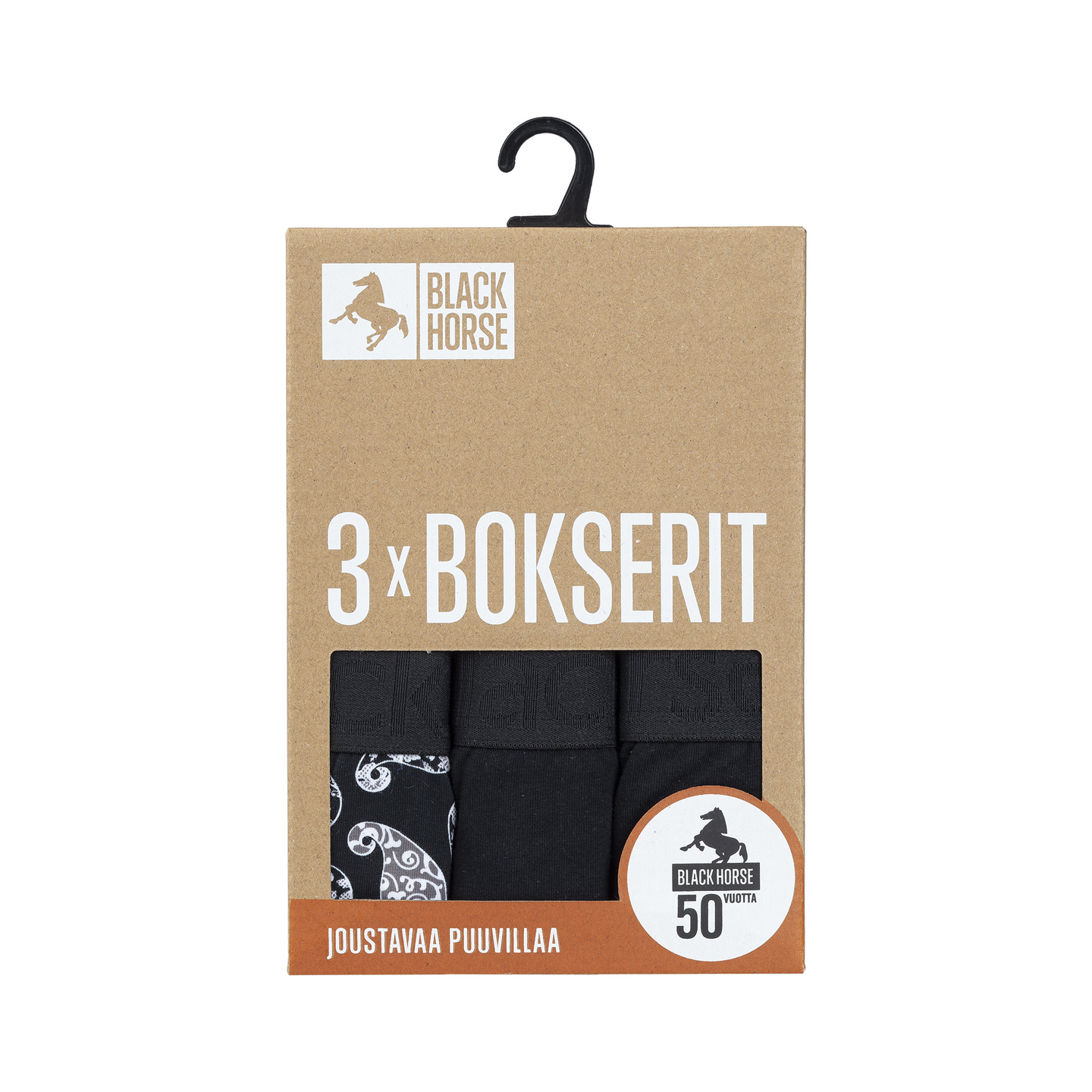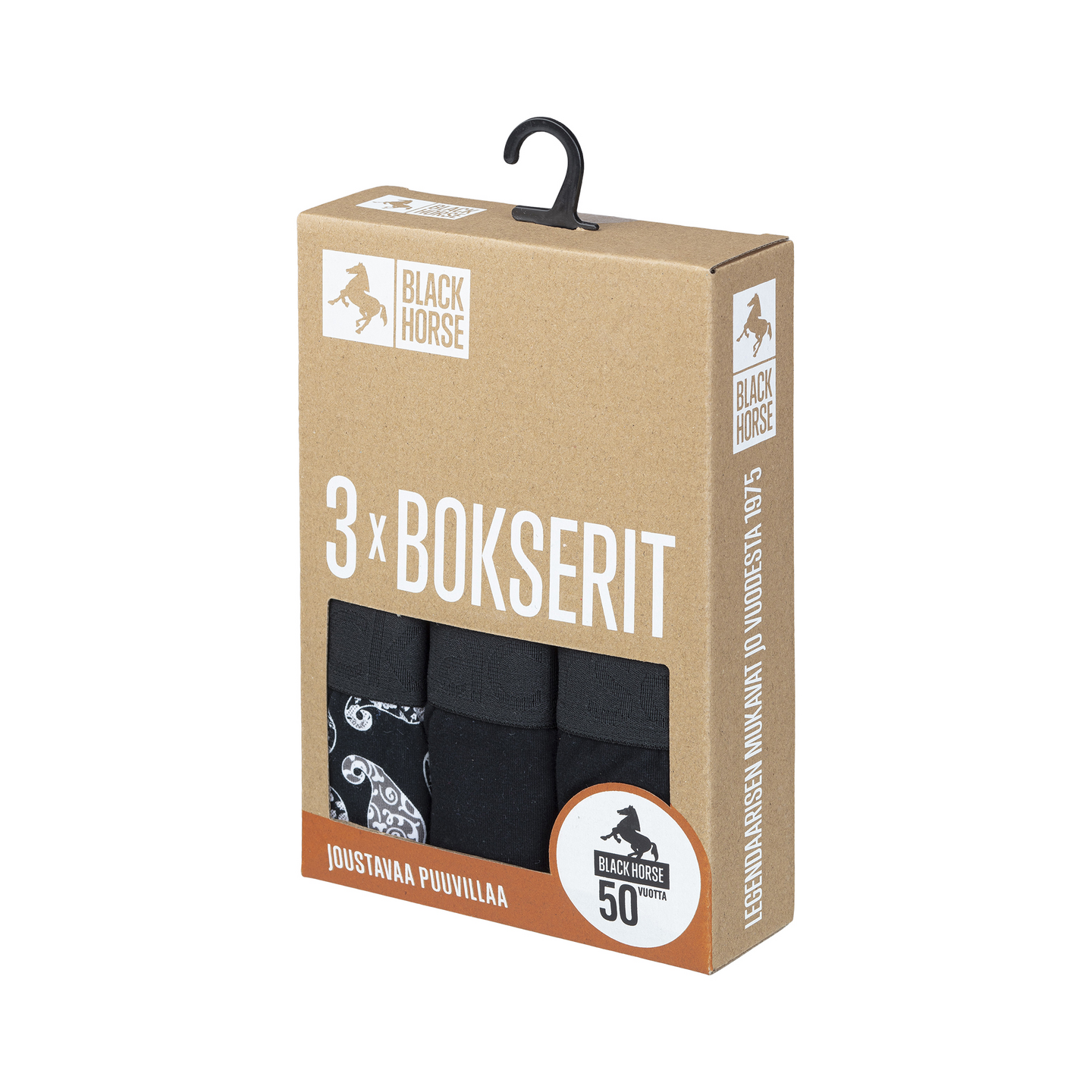 Joustavasta BCI-puuvillasta valmistetut Black Horse bokserit istuvat täydellisesti ja ovat mukavat päällä koko päivän. Boksereissa leveä vyötärönauha ja ihanteellinen lahkeenpituus. Ei hiertäviä saumoja tai pesulappuja – vain täydellinen mukavuus. Aukoton malli. Kolmen kappaleen pakkaus.