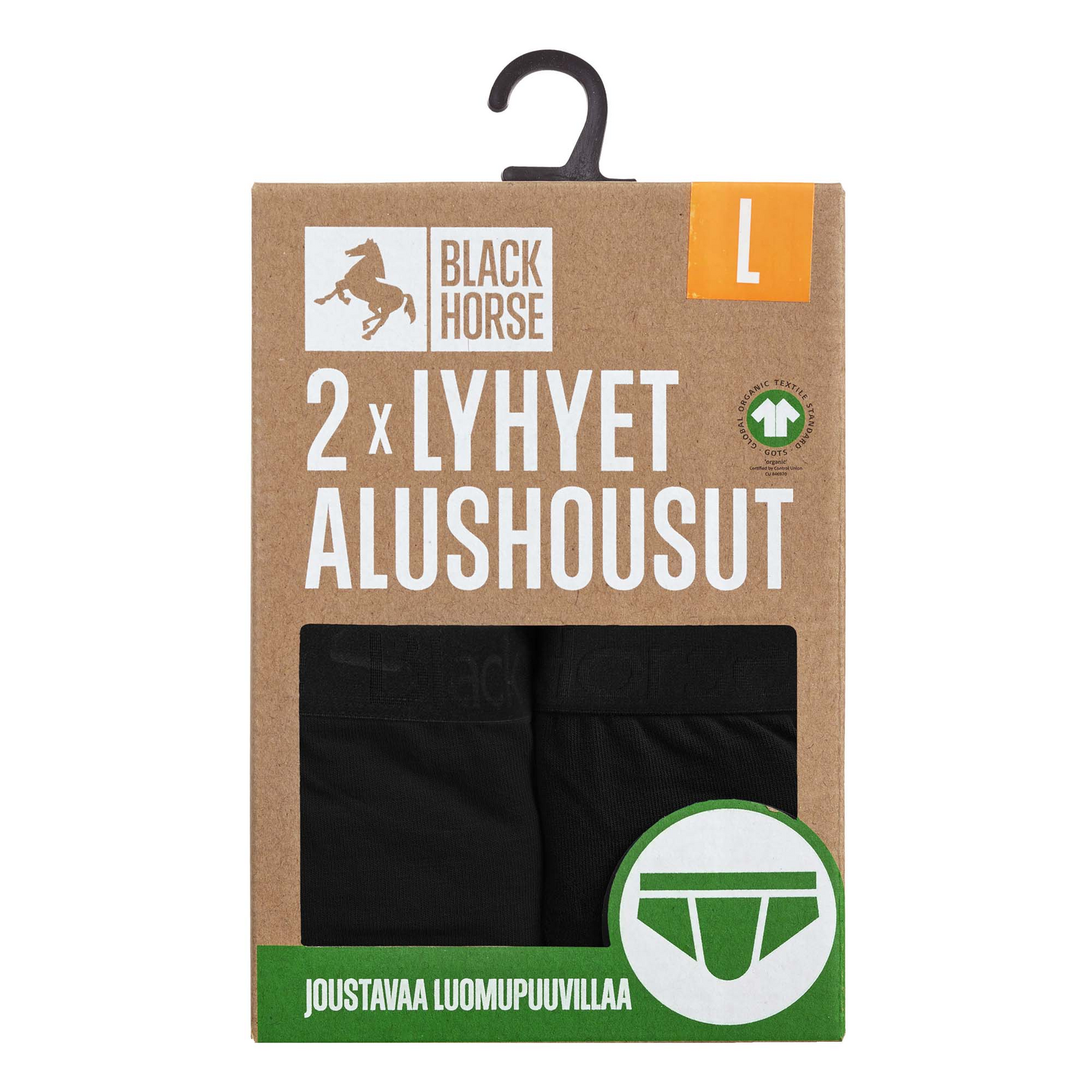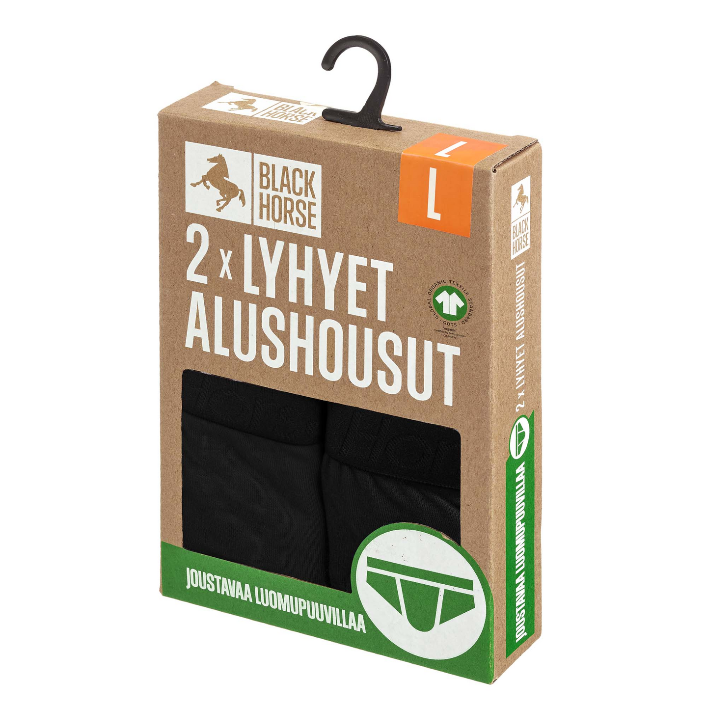 Black Horsen aukottomat lyhyet alushousut kahden kappaleen pakkauksessa. Pehmeä materiaali tuntuu mukavalta koko päivän ja leveä vyötärökuminauha pitää alushousut hyvin paikallaan. Ei kutittavia tai hiertäviä etikettejä - pesuohjeet painettu suoraan kankaalle. Kaksinkertainen etuosa. Materiaali on miellyttävää luomupuuvillaa ja elastaania. GOTS-sertifiointi takaa tuotteen ekologisuuden ja eettisyyden huomioiden koko tuotantoketjun.