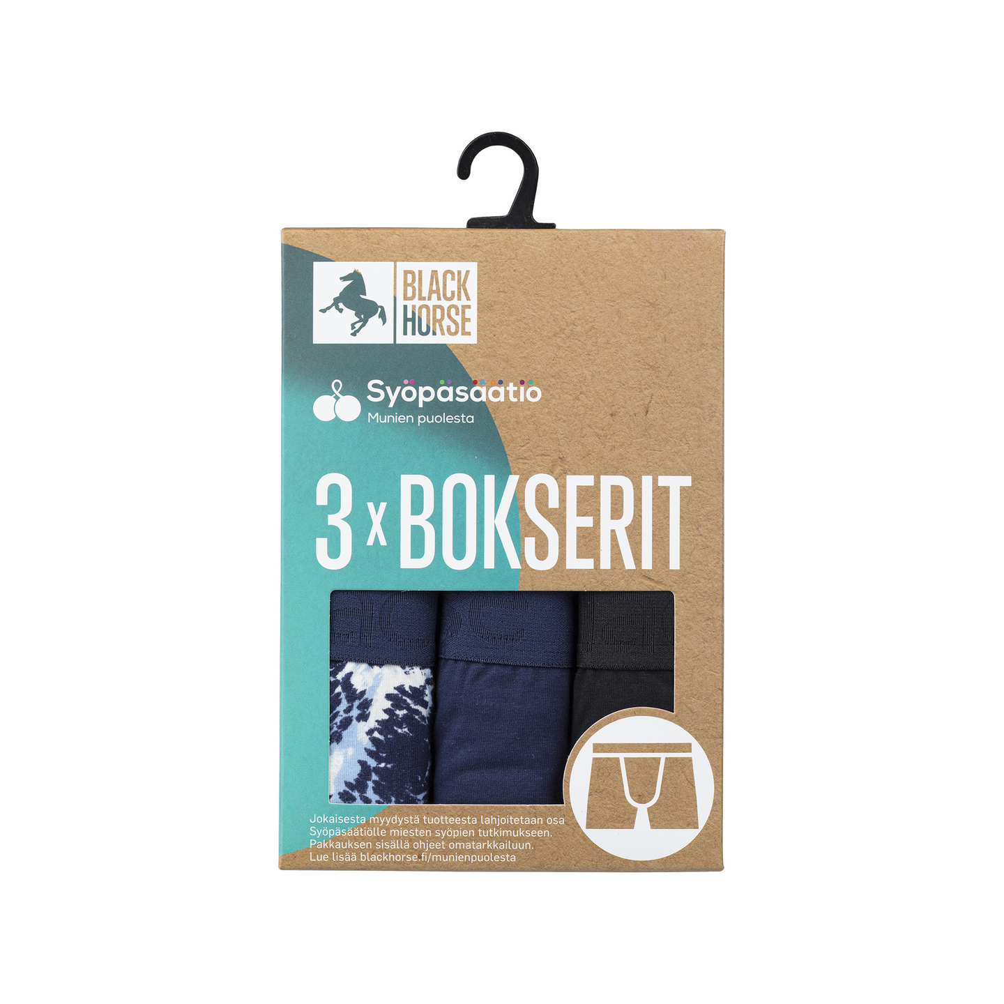 Black Horsen joustavasta puuvillasta valmistetut aukottomat bokserit istuvat täydellisesti ja ovat mukavat päällä koko päivän. Kolmen kappaleen pakkaus. Leveä vyötärökuminauha ja ihanteellinen lahkeenpituus takaavat erinomaisen istuvuuden. Ei hiertäviä saumoja tai pesulappuja – vain täydellinen mukavuus. Munien puolesta -kampanjatuote, joka sisältää ohjeet kivesten omatarkkailuun. Jokaisesta myydystä tuotteesta lahjoitetaan osa Suomen syöpäsäätiölle miesten syöpien tutkimukseen.