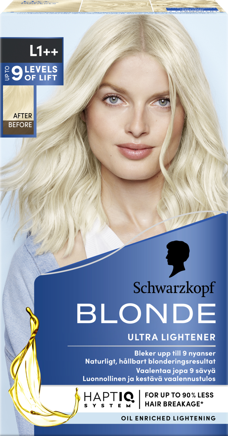 Schwarzkopf Blonde -vaalennusaineet ovet Pohjoismaiden tunnetuimpia ja suosituimpia vaalennustuotteita! Hoitoaineen violetit pigmentit auttavat vähentämään keltaisia vivahteita ja HaptIQ-teknologia suojaa hiuksiasi värjäyksen jälkeen: · Luomalla uusia mikrosäikeitä hiuskuituihin · Luoden suojaavan kerroksen hiuksen ympärille värjäyksen jälkeen · Vahvistaen hiuksia vähentäen jopa 90% hiusten katkeilua* antaen pitkäkestoisen hiusvärin Schwarzkopf Blonde L1++ Ultra -vaalennusvoide vaalentaa hiuksia jopa 9 astetta lisäämättä pigmenttiä (värinpoisto). Sopii keskivaaleista vaaleanruskeille hiuksille. Sisältää: Vaalennusaine 60 ml Kehite-emulsiopullo 60 ml Vaalennusjauhe 10 g Blonde-hoitoaine 22,5 ml Suojakäsineet Käyttöohje