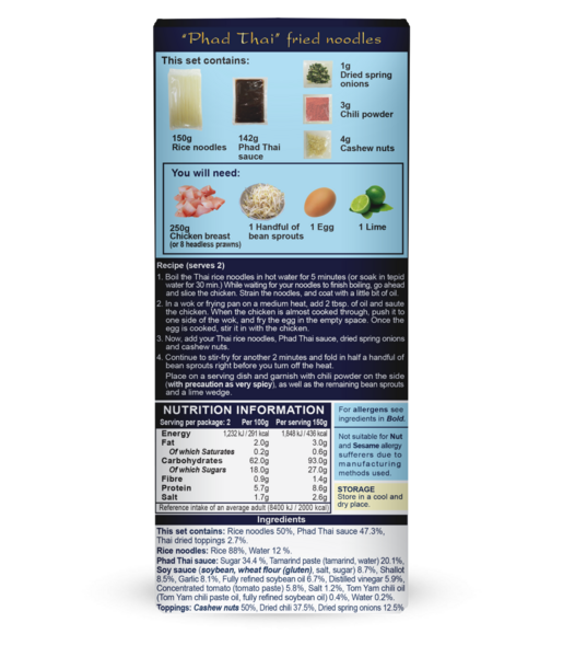 Blue Elephant Phad Thai -ateriapakkaus sisältää aidot thaimaalaiset ainekset perinteisen Pad Thai -annoksen valmistamiseen kotona. Tämä ateriapakkaus yhdistää laadukkaat riisinuudelit, täyteläisen Pad Thai -kastikkeen ja thaimaalaisen kuivamausteseoksen, jotka yhdessä takaavat herkullisen makuelämyksen. Helppo ja nopea valmistaa – lisää vain tuoreita ainesosia, kuten kanaa, katkarapuja tai tofua, ja nauti perinteisestä thaimaalaisesta Pad Thaista omassa keittiössäsi. Ei sisällä keinotekoisia maku-, väri- tai säilöntäaineita. Allergeenit: Sisältää soijaa, cashewpähkinää ja vehnää. Valmistettu tehtaassa, jossa käsitellään seesamia ja maapähkinöitä.