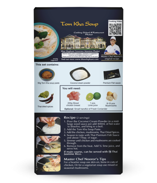 Blue Elephant Tom Kha -ateriapakkaus sisältää kaikki tarvittavat ainekset perinteisen thaimaalaisen Tom Kha -keiton valmistamiseen kotona. Tämä ateriapakkaus yhdistää aidot thaimaalaiset maut ja laadukkaat raaka-aineet, kuten galangalin, sitruunaruohon, kaffirlimetinlehdet ja kookosmaidon jauheena, tuoden keittoon täyteläisen ja raikkaan maun. Pakkaus sisältää Tom Kha -tahnan, kookosmaidon jauheen, premium-kalakastikkeen ja thaimaalaisen kuivamausteseoksen, jotka yhdessä takaavat aidon thaimaalaisen makuelämyksen. Helppo ja nopea valmistaa – lisää vain tuoreita aineksia, kuten katkarapuja, kanaa tai kasviksia, ja nauti herkullisesta Tom Kha -keitosta kotona. Ei sisällä keinotekoisia lisäaineita. Sopii niille, jotka haluavat valmistaa perinteistä thaikeittiön klassikkoa helposti. Allergeenit: Sisältää kalaa, maitoa ja kookosta. Valmistettu tehtaassa, jossa käsitellään seesamia ja maapähkinöitä.