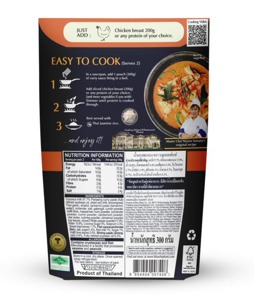 Blue Elephant Panaeng Currykastike on täyteläinen ja aromaattinen thaimaalainen kastike, joka yhdistää kookosmaidon kermaisuuden ja perinteisten mausteiden syvyyden. Huolella valmistettu currytahna sisältää kuivattua punaista chiliä, sitruunaruohoa, galangalia ja korianteria, jotka luovat herkullisen ja tasapainoisen makuprofiilin. Tämä kastike sopii täydellisesti kana-, naudan- tai kasvisruokiin ja tuo aitoa thaimaalaista makua kotikeittiöön. Helppo ja nopea käyttää – kuumenna kastike, lisää proteiini tai kasvikset ja nauti. Ei sisällä keinotekoisia maku-, väri- tai säilöntäaineita. Allergeenit: Sisältää äyriäisiä, kalaa ja kookosta. Ei sovi pähkinä- ja seesamiallergikoille tuotantomenetelmien vuoksi.