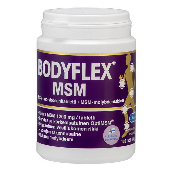 Vahvat Bodyflex MSM –tabletit sisältävät erittäin puhdasta ja korkealaatuista OptiMSM® metyylisulfonyylimetaania (MSM) 1200 mg ja 12,5 µg molybdeenia yhdessä tabletissa. MSM on orgaaninen, vesiliukoinen rikkiyhdiste, jota on luontaisesti ihmiskehossa. Sen pitoisuudet ovat korkeimmillaan erityisesti lihaksissa, nivelissä, ihossa, kynsissä ja hiuksissa. Monipuolisesti vaikuttava MSM tukee aktiivista ja terveellistä elämäntapaa ja sitä suositellaankin erityisesti urheilijoille ja kuntoilijoille osana lihashuoltoa. Molybdeeni on ihmiselle välttämätön hivenaine, joka edistää normaalia rikkiaminohappoaineenvaihduntaa. Laktoositon, hiivaton, makeuttamaton, gluteeniton. Valmistettu Suomessa.