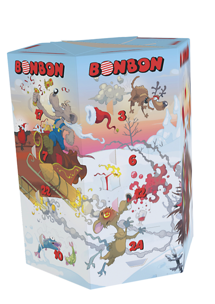 Ainutlaatuisen BonBon-joulukalenterin kuvitus on taattua tuttua hullunhauskaa huvittelua ja on kaikkea muuta kuin tavanomainen joulukalenteri. Kalenteri sisältää BonBon-makeisia ja luukkujen takaa paljastuu lisää hauskoja BonBon-aiheisia kuvituksia.