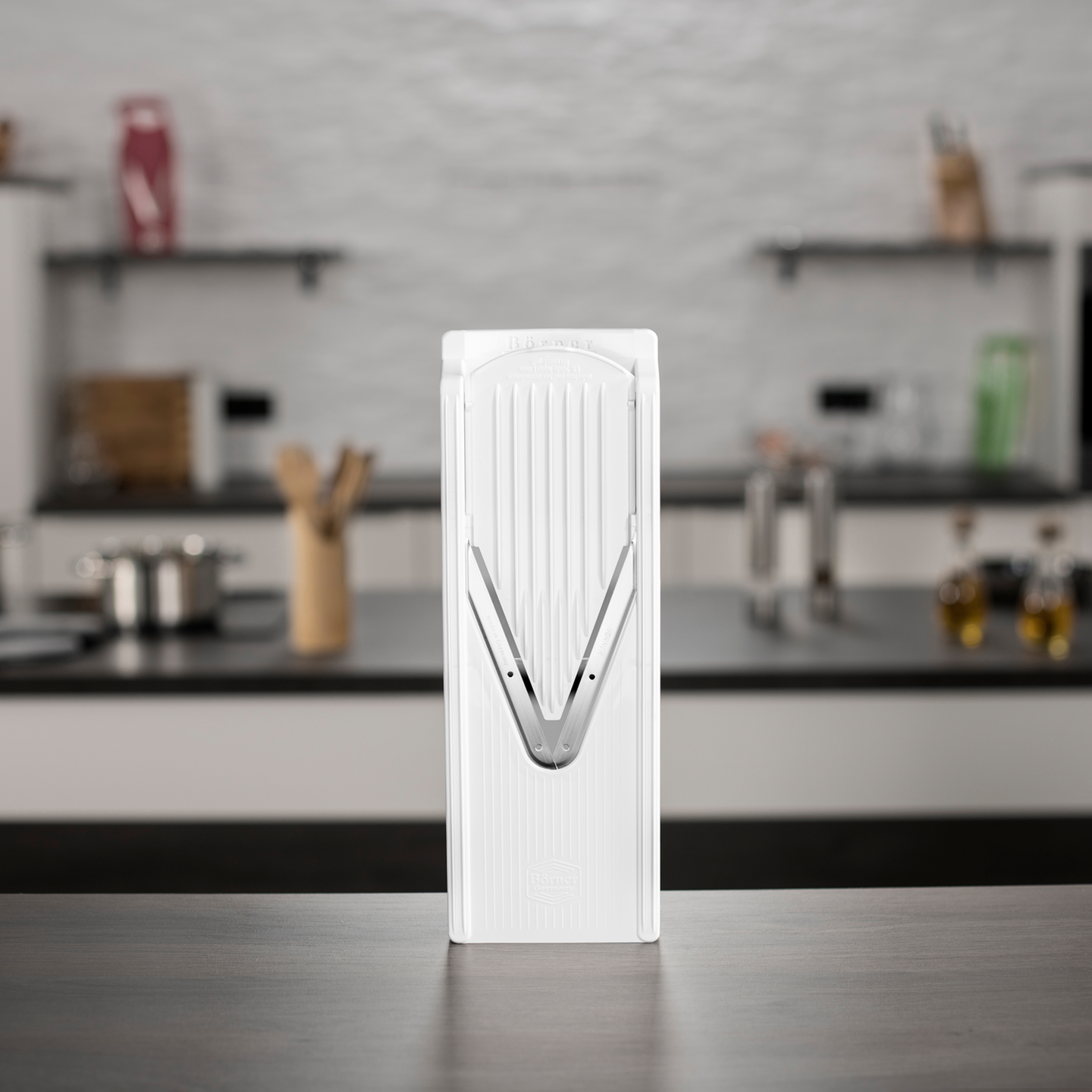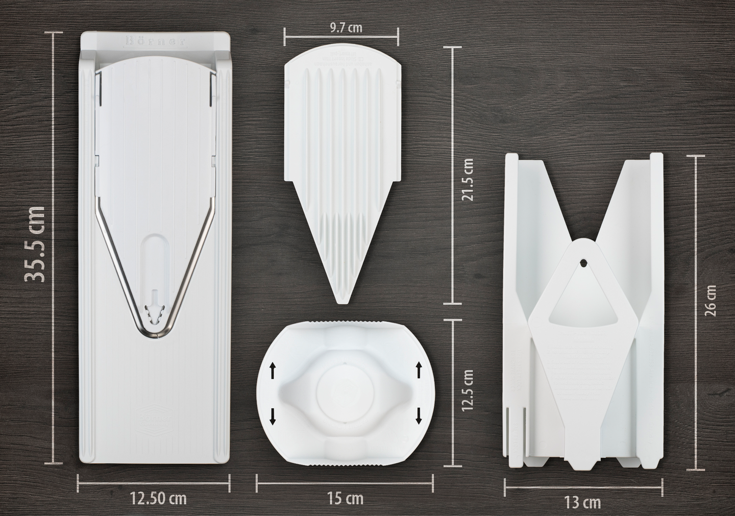 V3-mandoliini on maineensa arvoinen klassikkomalli! Kestävä ja huippulaadukas V3 edustaa ensiluokkaista saksalaista osaamista ja on erittäin suosittu ympäri maailman. V3-mandoliinin avulla voit tehdä vihanneksista ja hedelmistä sekä ohuita että paksuja viipaleita. Terillä varustettuja viipalointilevyjä (3,5 mm tai 7 mm) käyttämällä onnistuvat suikaleet ja jopa kuutiot. Terät ovat äärimmäisen terävät, joten suosittelemme, että käytät mukana tulevaa turvapidikettä aina mandoliinia käyttäessäsi. Pakkaukseen sisältyvä multibox-säilytysteline on kätevä ja turvallinen säilytyspaikka mandoliinille ja mukana tuleville varusteille. Astianpesukoneessa terät saattavat tylsyä nopeammin, joten suosittelemme käsinpesua. Huuhtele mandoliini heti käytön jälkeen juoksevan veden alla. Käytä tarvittaessa astianpesuainetta ja tiskiharjaa, mutta varo tylsyttämästä terää tiskiharjalla. Pakattu kierrätettävään kartonkipakkaukseen.