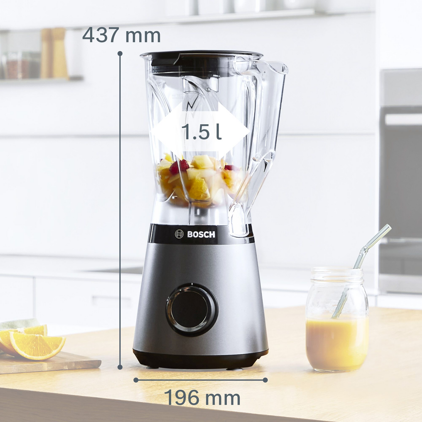 Jään murskaaminen ja kovien raaka-aineiden leikkuu vaatii tehokkaan moottorin. Valmista pehmeitä smoothieita ja pirtelöitä tai vaikka pestoa 1200 Watin moottorilla, jonka kierrosluku nousee jopa 30 000 kierrokseen minuutissa. Moottori, joka pystyy melkein mihin vain. Bosch – moottoriosaamista keittiöön jo vuodesta 1955.