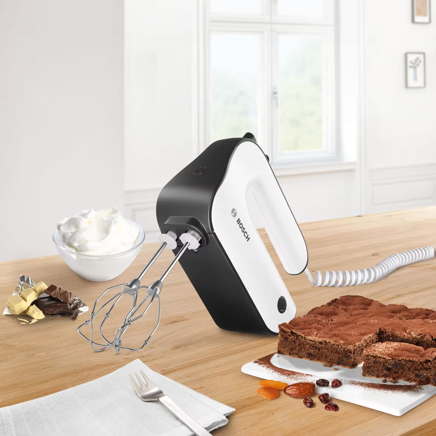 Valkoisen ja antrasiitin värinen design-sähkövatkain vaativaan makuun. Innovatiivinen vispilämuotoilu nopeuttaa vatkausta.