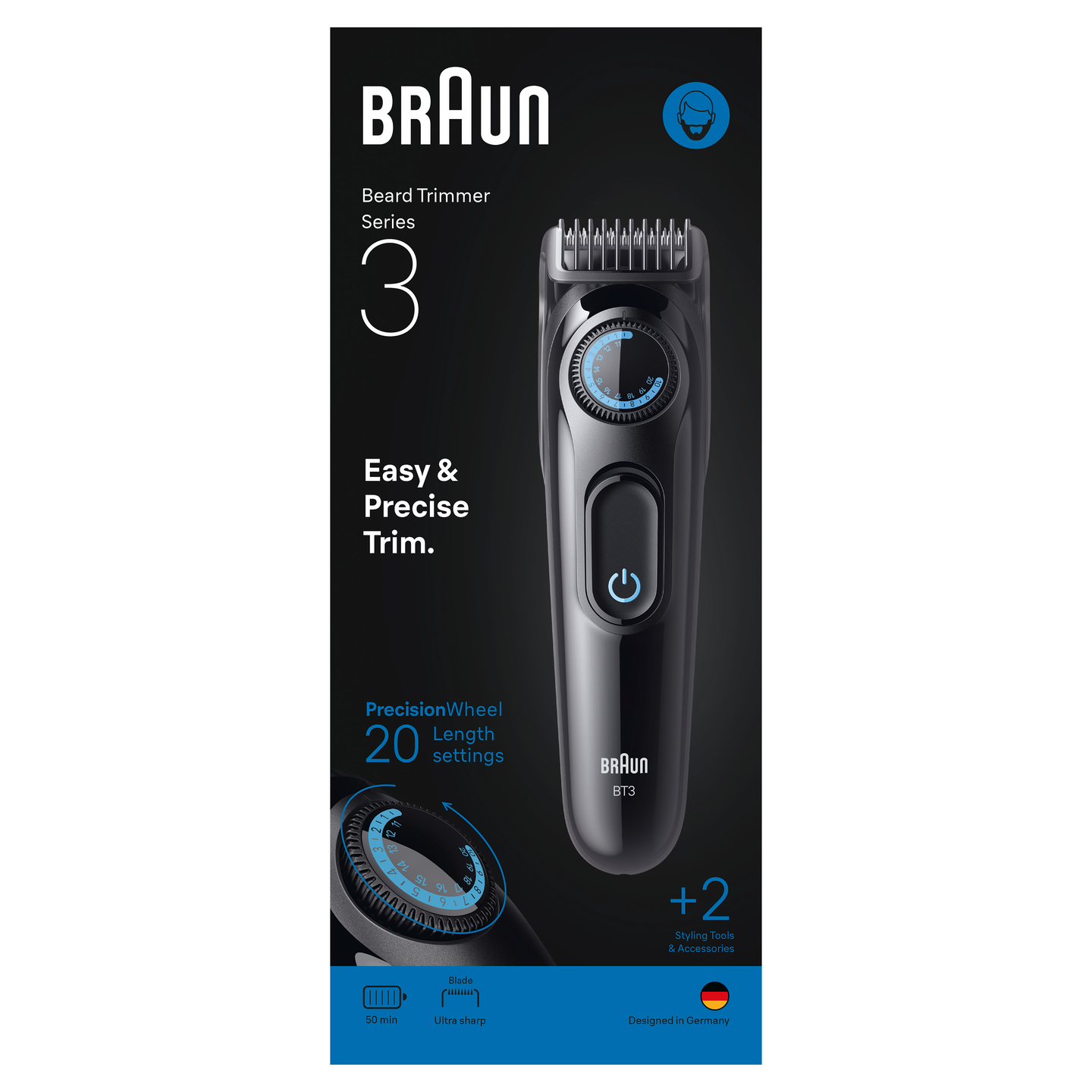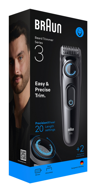 Braun Series 3 -partatrimmeri vaivattomaan täydelliseen groomingiin. Suunniteltu tarkkuuteen ja täydellisyyteen jokaisella vedolla. Ultra Sharp Blade -terä varmistaa tasaisen trimmauksen joka kerta. Virheetön muotoilu 20 pituusasetuksilla 0,5 mm:n välein. 50 minuutin langaton käyttöaika, joten olet valmis saavuttamaan tyylisi helposti.