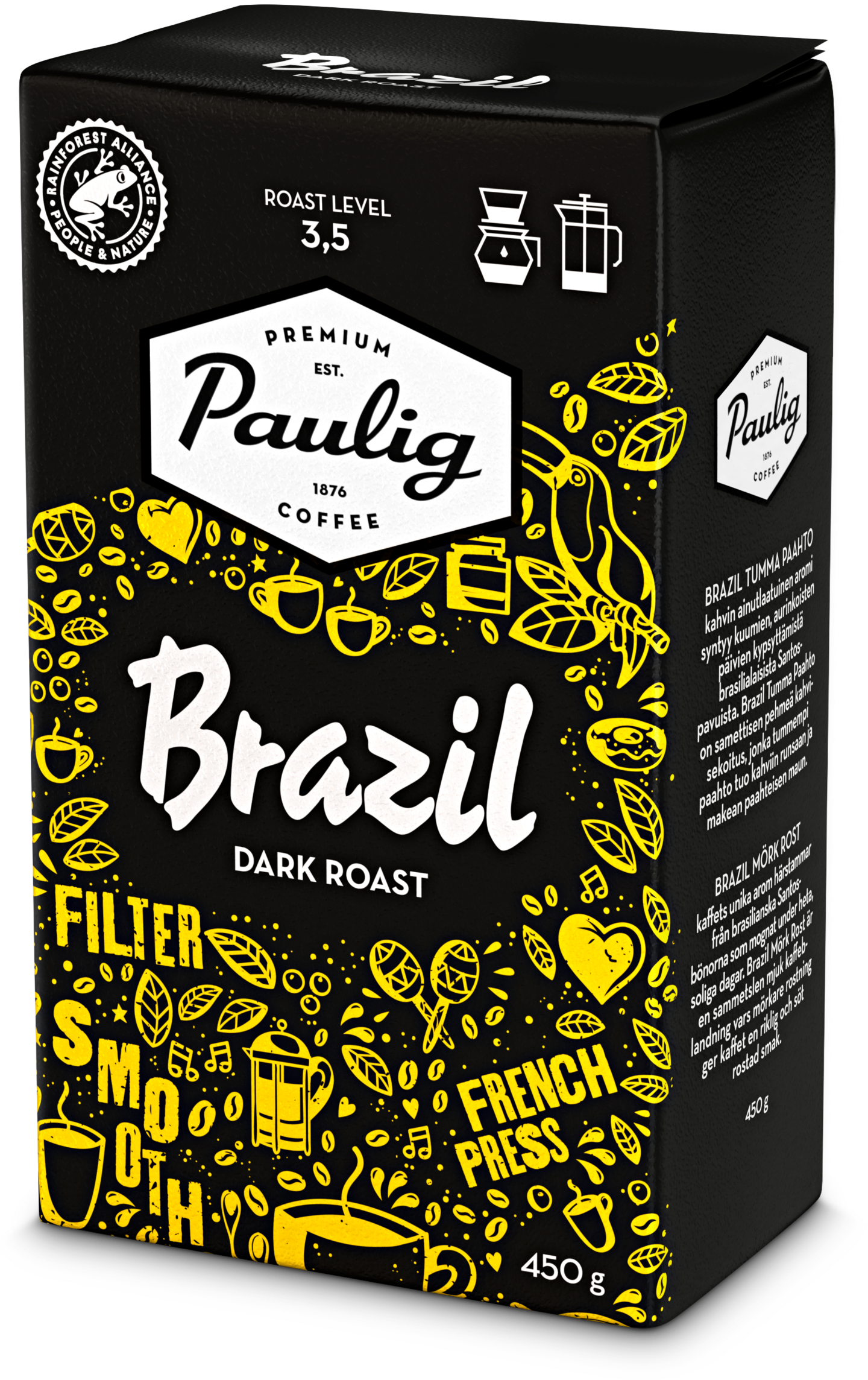 Brazil Dark Roast -kahvi on samettisen pehmeä arabica-kahvisekoitus, jonka tumma paahto tuo kahviin runsaan ja paahteisen makean maun. Brazil Dark Roast -kahvi maistuu erityisesti tumman kahvin ystäville, jotka haluavat nauttia kahvinsa pehmeänä ja makeahkona. Brazil Dark Roast -kahvin ainutlaatuinen aromi syntyy kuumien, aurinkoisten päivien kypsyttämistä brasilialaisista Santos-pavuista. Paahtoaste 3,5. Rainforest Alliance -sertifioitu. Lisätietoa: ra.org • Tummapaahtoinen, samettisen pehmeä ja makean paahteinen suodatinkahvi • Valmistus suodatinmenetelmällä tai pressopannulla • Saatavilla myös papukahvina