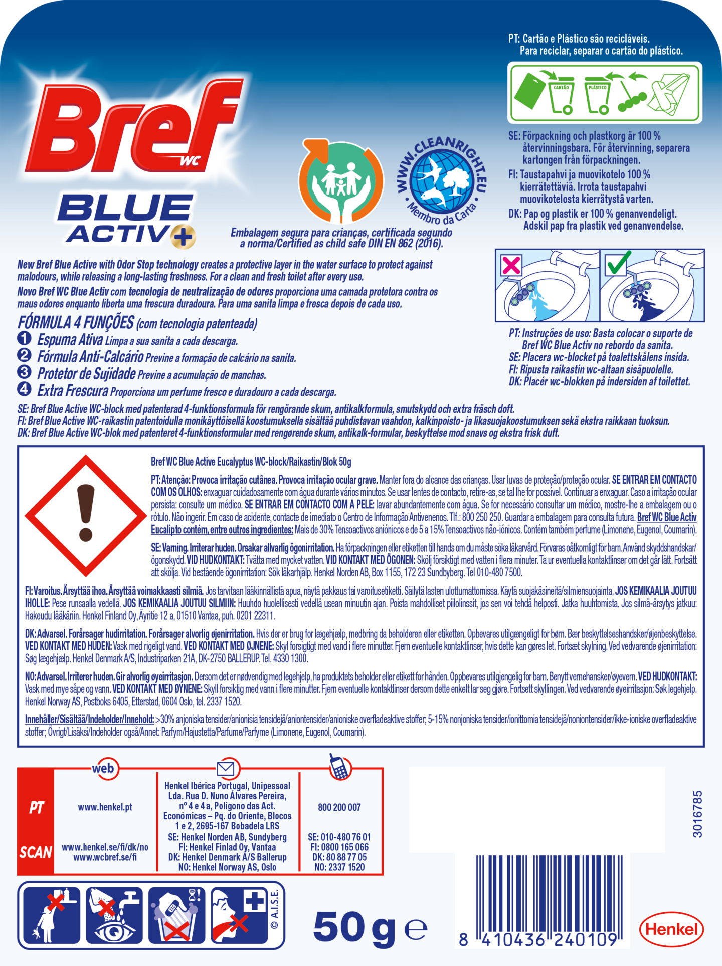 Bref Blue Activ WC-raikastin, jossa eukalyptuksen tuoksu ja Odor-Stop-teknologia Bref Blue Activ WC-raikastimessa on Odor-Stop-teknologia, joka luo suojaavan esteen hajuja vastaan ja vapauttaa pitkäkestoista raikkautta. Neutralisoi hajut jokaisen käyttökerran jälkeen. Näet puhdistuksen konkreettisesti, kun vesi muuttuu siniseksi ja pitkäkestoinen kukkaistuoksu täyttää kylpyhuoneen. Bref Blue Activ WC-raikastimessa on 4 toimintoa: 1) Puhdistusvaahto puhdistaa wc-istuimen jokaisella huuhtelukerralla. 2) Kalkinpoistoaine estää kalkin muodostumisen wc-istuimeen. 3) Likasuoja estää likaa tarttumasta kiinni. 4) Ekstraraikkaus jättää kylpyhuoneeseen pitkäkestoisen raikkaan tuoksun. Ripusta tuoksuva WC-raikastin WC-istuimen reunaan ja säädä se siten, että se osuu huuhteluveteen. Kun WC-istuin huuhdellaan, tunnet puhtaan ja tuoreiden kukkien tuoksun kylpyhuoneessa. Kartonki ja kori ovat 100 % kierrätettäviä. Poista WC-raikastimen kartonki pakkauksesta kierrätystä varten.