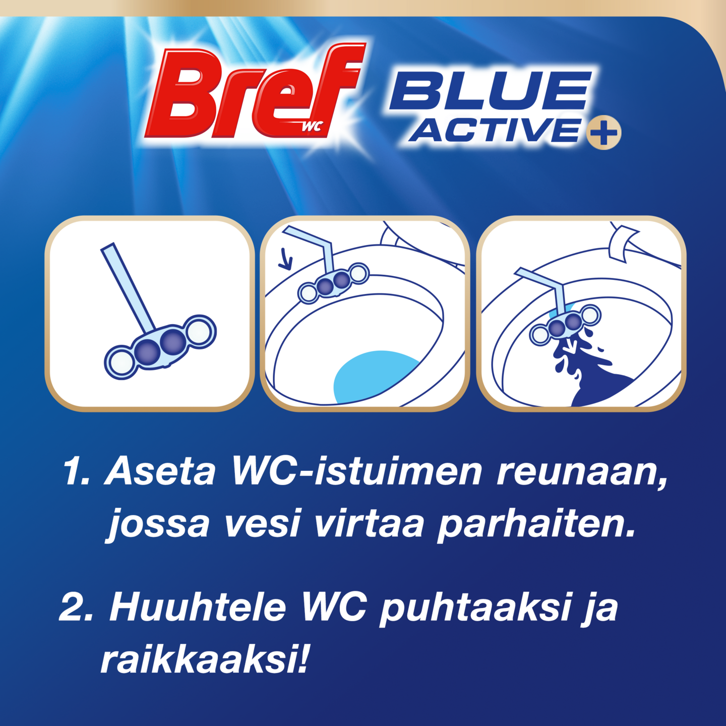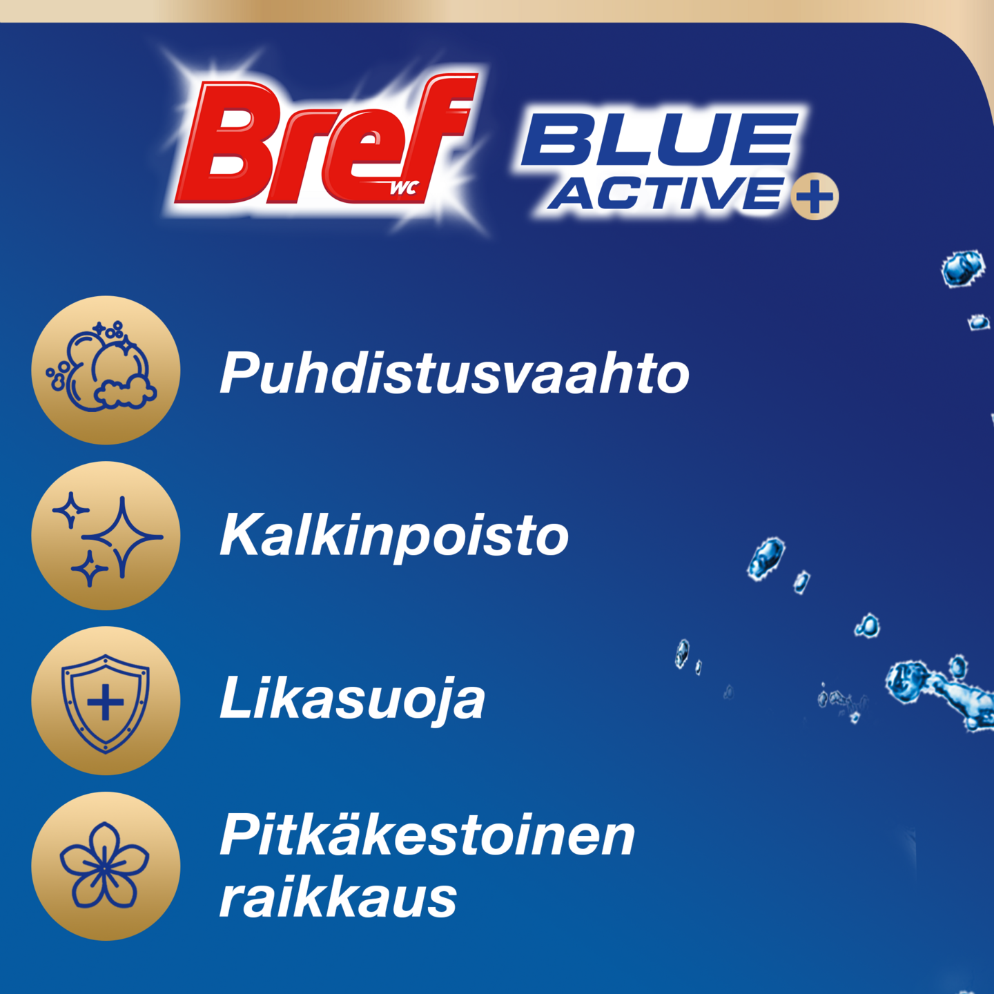 Bref Blue Active Chlorine on WC-raikastin, jossa on sinisen huuhtelun lisäksi hurmaava kukkaistuoksu. 50% enemmän kiiltoa puhdistavan polymeerin ansiosta sekä hajua estävä teknologia. WC-raikastin jättää WC altaan erittäin puhtaaksi ja raikkaaksi pitkäksi aikaa.